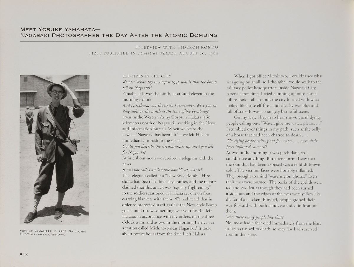 Yamahata’s photographs, of which he took a total of 119 on August 10, 1945, are the only extensive photographic record of the immediate aftermath of the atomic bombing of either Hiroshima or Nagasaki, and he had some of them published in the August 21, 1945, issue of Mainichi Shinbun. MacArthur and the American military soon occupied Japan, imposing strict censorship on any reporting or publishing of images of the atomic bombing of Nagasaki, with orders to seize and destroy any evidence found, which would have included Yamahata’s photographs. After the occupation forces left Japan, Yamahata was able to publish Atomize Nagasaki and some of his photographs appeared in the September 29, 1952 issue of Life Magazine. However, soon after the publication of this book, Yamahata became disillusioned by the peace groups that were using his photographs for their own propaganda purposes and, for the most part, withdrew his images from circulation. It was not until 1995 that they reemerged when a controversial Smithsonian exhibition of the photographs was scheduled and subsequently cancelled.