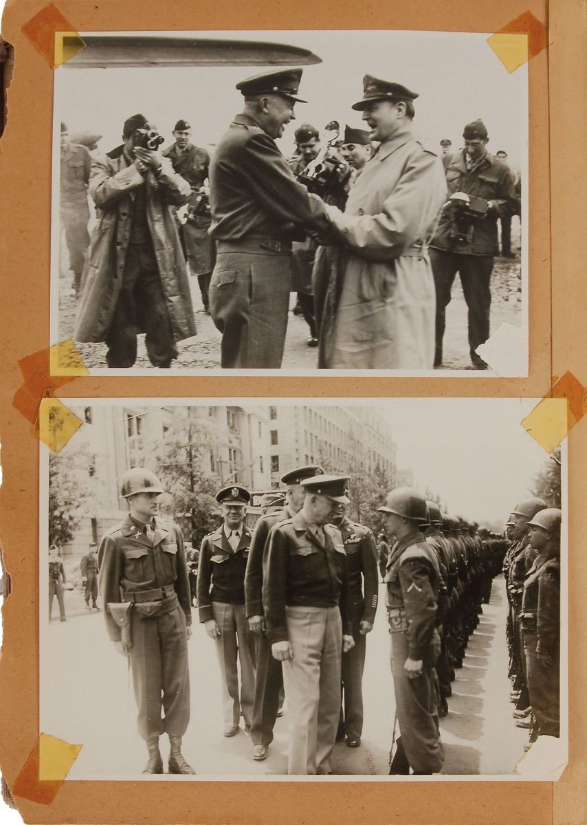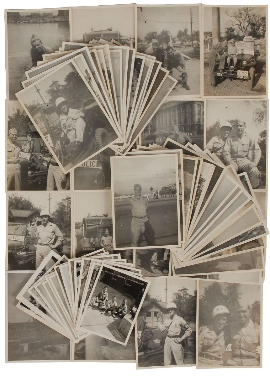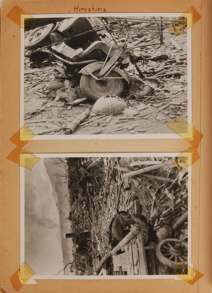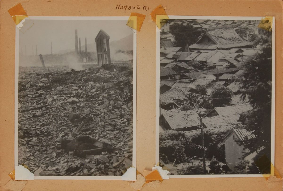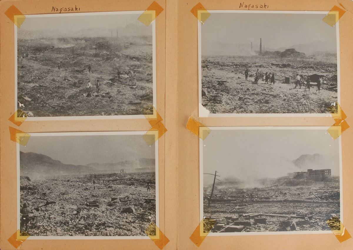 Historically significant collection of photographs compiled in Japan by an American MP in the aftermath of the bombings of Hiroshima and Nagasaki in World War II, consisting of approximately 250 photographs ranging in size from 1.25 x 1.5 to 6.25 x 4.5, most affixed within a disbound hardcover album. Within the album are 24 photographs taken by Yosuke Yamahata, a Japanese military photographer, on August 10, 1945, a day after the atomic bomb was dropped on the city of Nagasaki (twelve of which the MP has mistakenly identified as “Hiroshima”). At some point between the end of September 1945 and July 1946, these were probably seized by the unidentified American MP who was stationed in Osaka and included them in this album with hundreds of other photos of himself and other MPs training and carrying out their duties. There is a larger size photograph of this MP dated ‘Dec. 1945 Osaka,’ which would place him in Japan only four months after the bombings, and many of the other images show himself and other MPs training and carrying out their duties; a candid photograph of Gen. Eisenhower and Gen. MacArthur inspecting troops is also in this album. Others show the beauty of the Japanese landscape as well as scenes of everyday life.