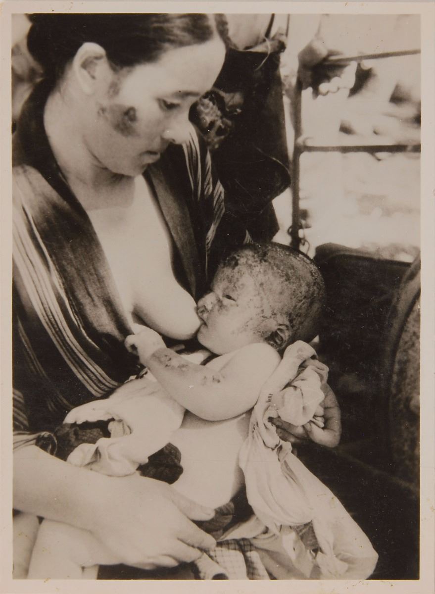 The photographs by Yamahata, which include twelve glossy and twelve matte-finish photos, show the immense destruction of buildings, vehicles, and the people of Nagasaki as a result of the atomic bomb. Two of the most famous images he took are present: one of a mother breastfeeding her child, which appeared in Life Magazine in 1952; and one of a young boy in a robe holding a rice ball, which was used as the cover image for the 1952 volume of Yamahata’s photographs entitled Atomized Nagasaki. In overall very good to fine condition, with album disbound, some toned tape to corners of photographs, and a few areas of emulsion or surface loss. Due to the extreme and graphic content of some of these historic images we will not be posting these images either in this catalogue or on our website. However we will send all images to those interested in this lot.