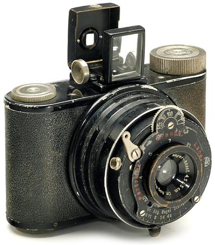"Ranca", 1930 Dr. Aug. Nagel, Stuttgart. Vorläufer-Modell der "Pupille". Mit Nagel-Anastigmat 4,5/5 cm, Verschluß 1/25-1/100, B, T. Format 3 x 4 cm auf 127er Film. - Viel seltener als "Pupille"!!
