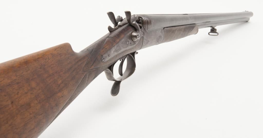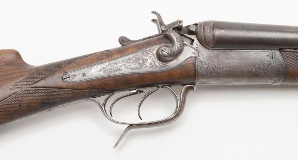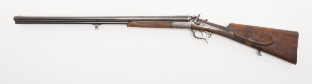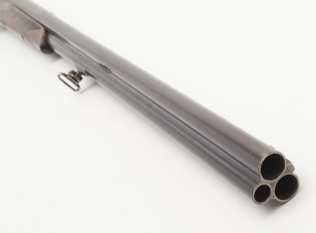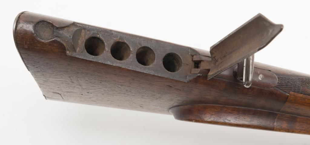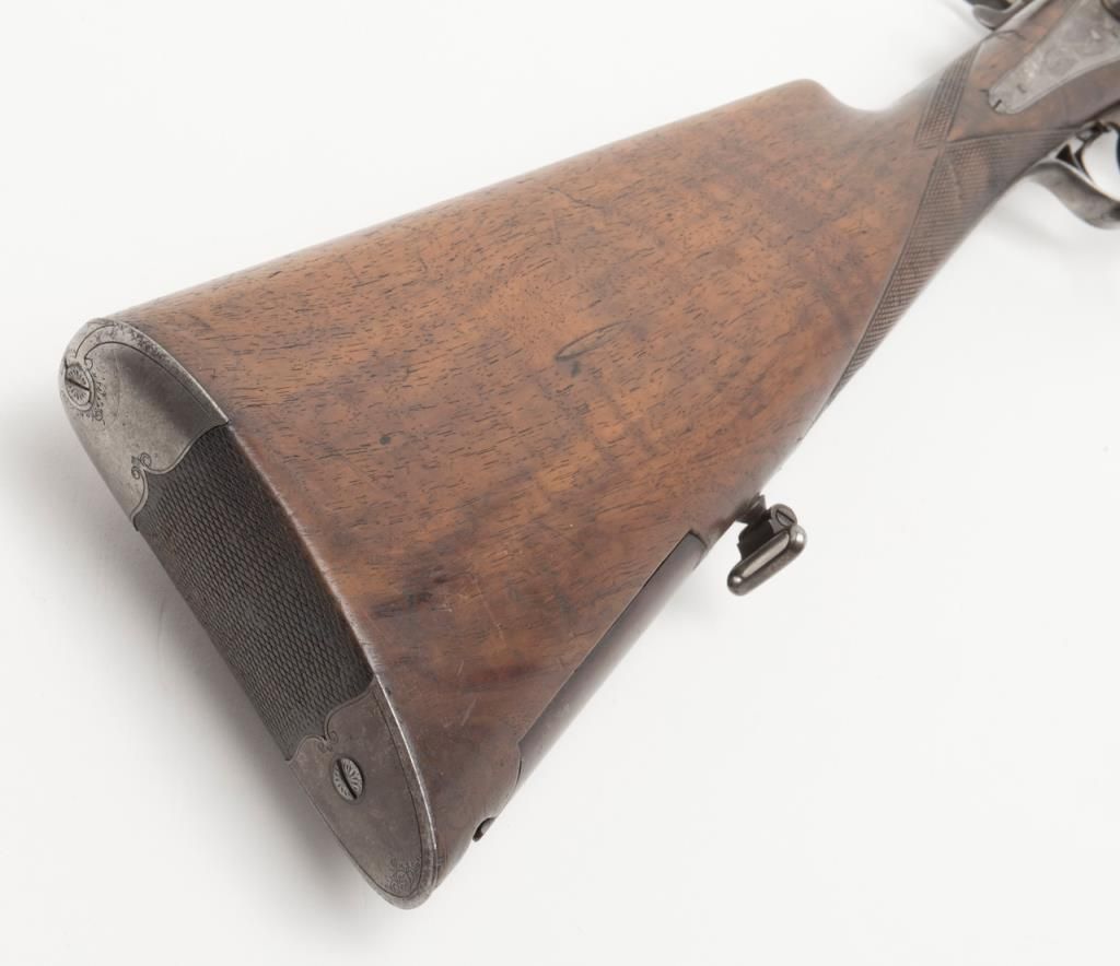 Nagel and Menz Under lever German drilling, 16 gauge and approximately 11 mm calibers, Serial #NSNV. The drilling is in overall good condition with 27” barrels. The barrels retain approximately 60% of its thinning blued finishwith the receiver going to a grey patina. The barrels are Krupp Steel and Nitro proof marked with a full length filed rib, folding rear and silver front sight. The receiver, side plates, hammers and tang are nicely scroll engraved andmarked Nagel and Menz. Interestingly the side plates are engraved, “HOFBUCHSENMACHER” which loosely translates into “Gunsmith to the crown”. The checkered wood stocks are Bavarian in style with numerous mars and compressions. An oldrepair has been made to the cheek piece and a bullet trap added to the butt. The rifle features an integral barrel mounted sling swivel and a finely checkered wood and metal butt. The bores are good, action crisp and markings sharp on thisfine old drilling. (Antique). Est.: $800-$1,600.