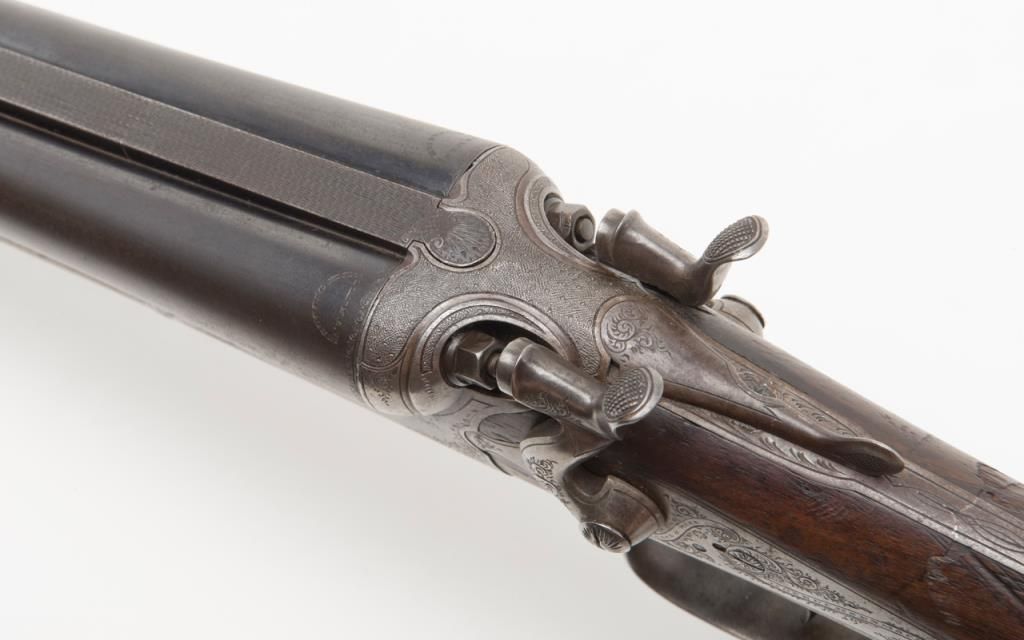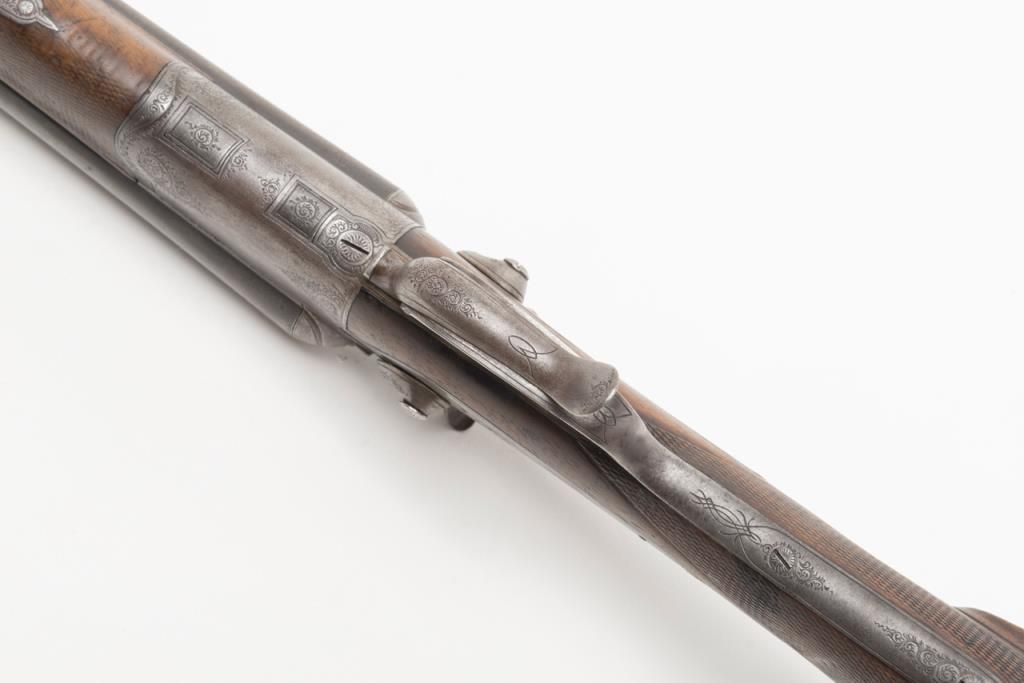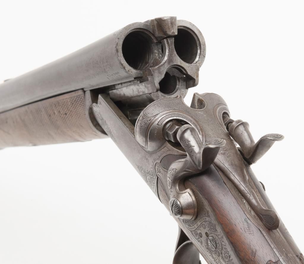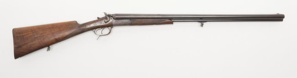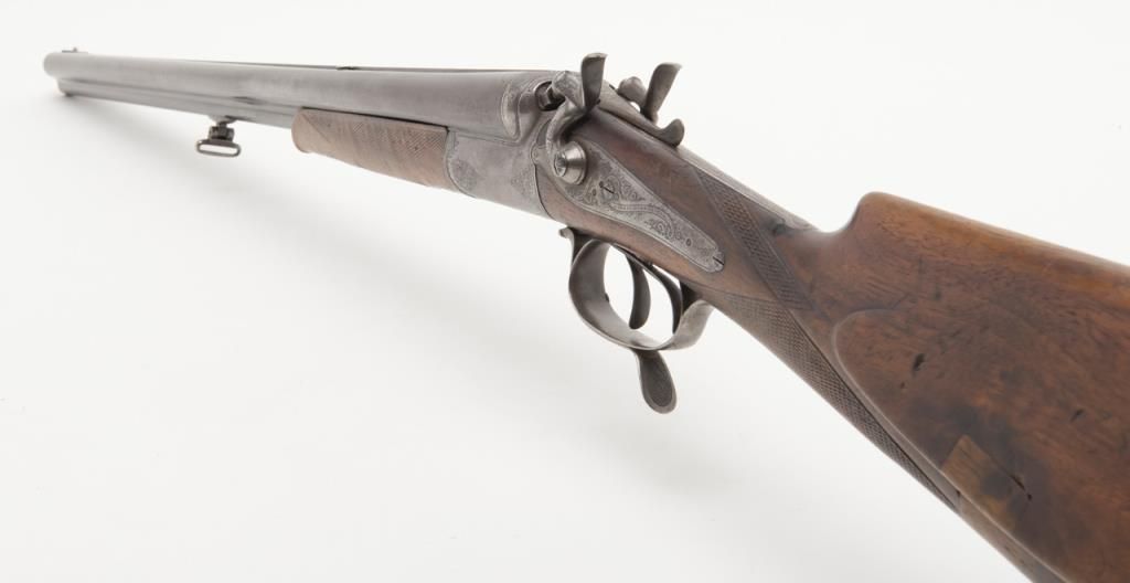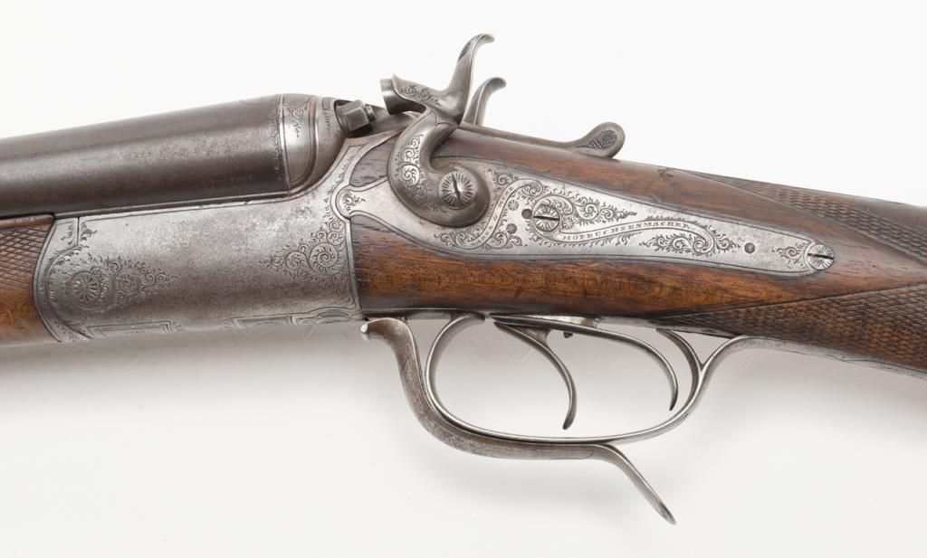 Nagel and Menz Under lever German drilling, 16 gauge and approximately 11 mm calibers, Serial #NSNV. The drilling is in overall good condition with 27” barrels. The barrels retain approximately 60% of its thinning blued finishwith the receiver going to a grey patina. The barrels are Krupp Steel and Nitro proof marked with a full length filed rib, folding rear and silver front sight. The receiver, side plates, hammers and tang are nicely scroll engraved andmarked Nagel and Menz. Interestingly the side plates are engraved, “HOFBUCHSENMACHER” which loosely translates into “Gunsmith to the crown”. The checkered wood stocks are Bavarian in style with numerous mars and compressions. An oldrepair has been made to the cheek piece and a bullet trap added to the butt. The rifle features an integral barrel mounted sling swivel and a finely checkered wood and metal butt. The bores are good, action crisp and markings sharp on thisfine old drilling. (Antique). Est.: $800-$1,600.