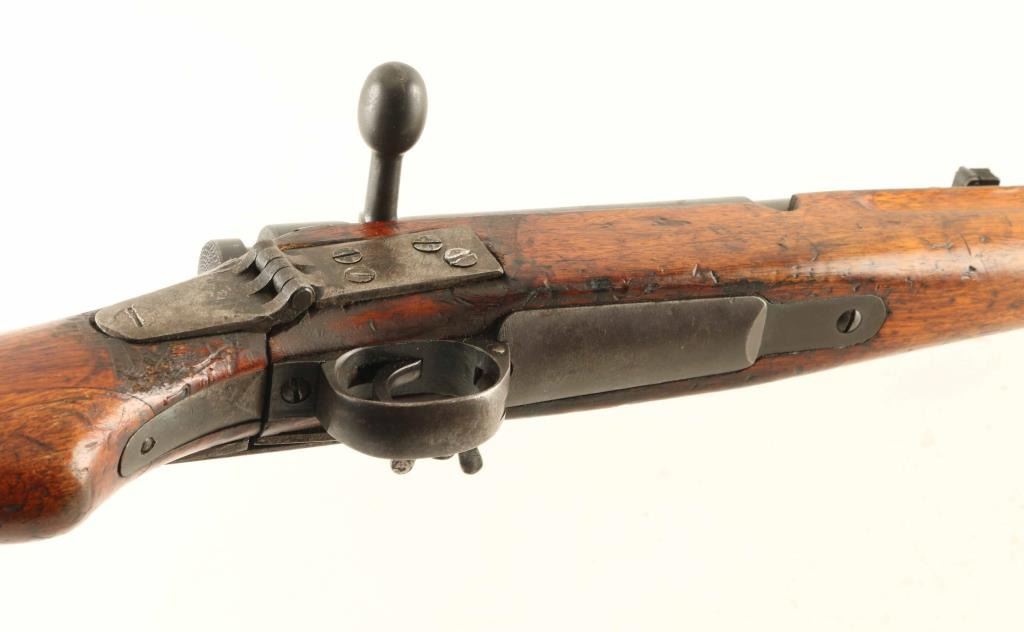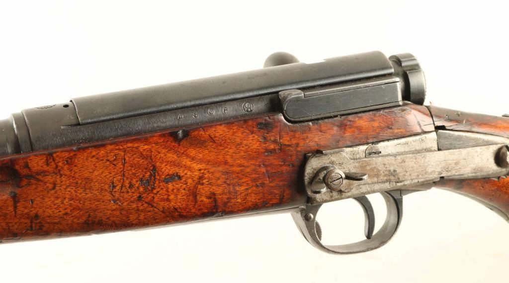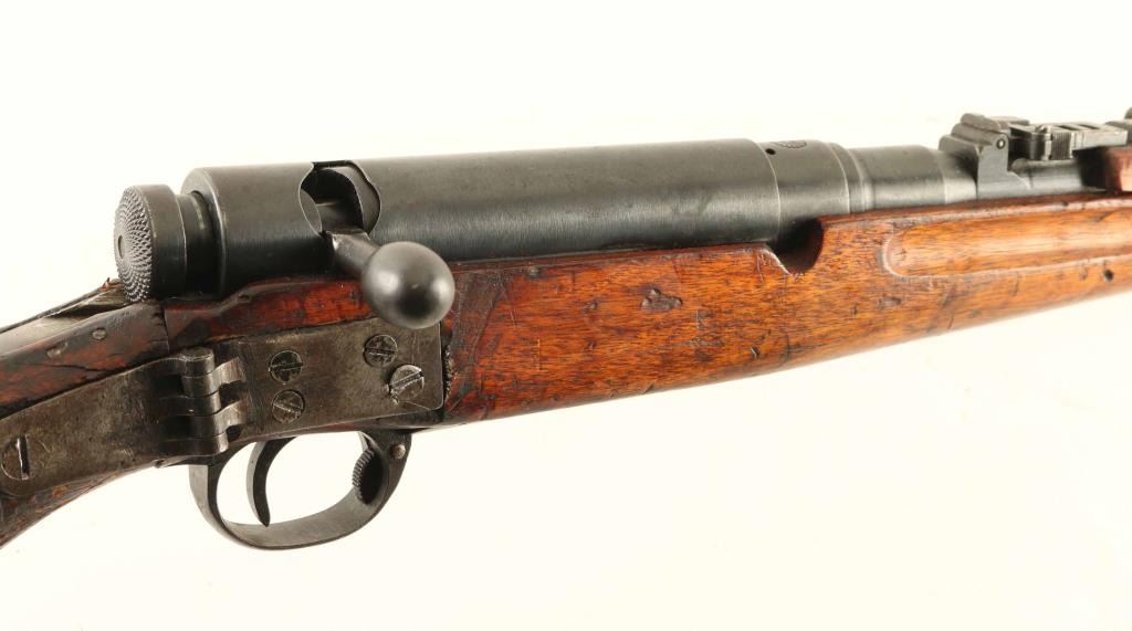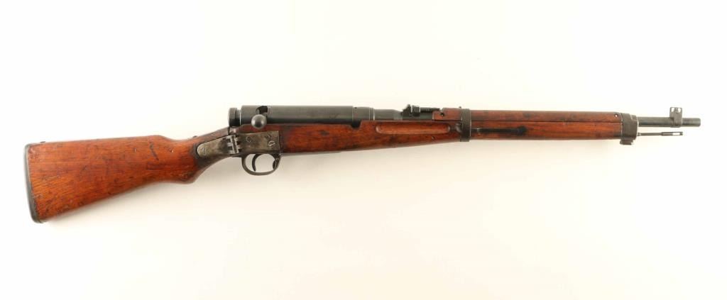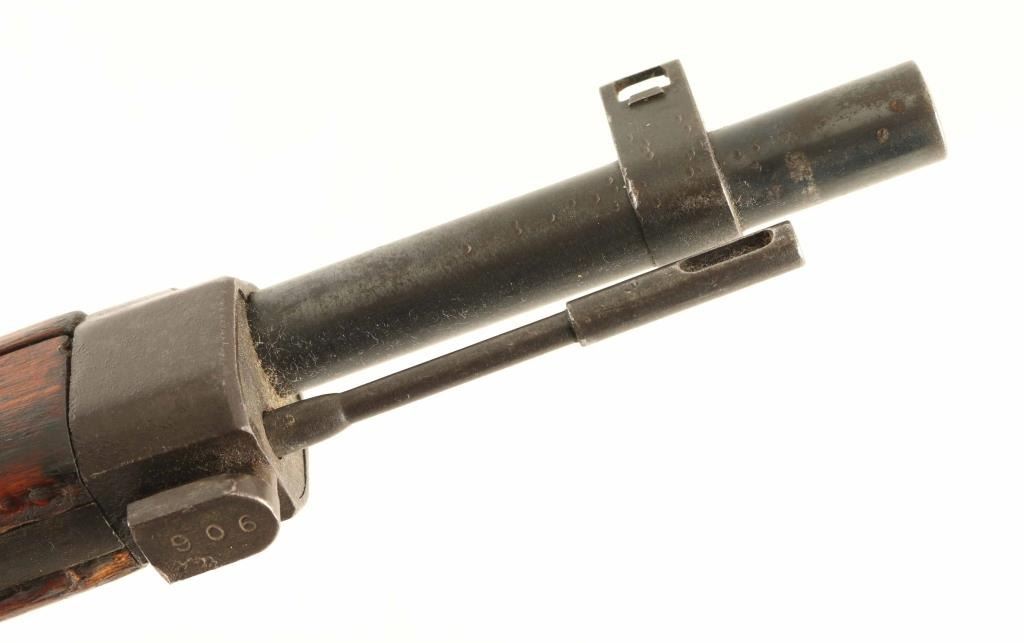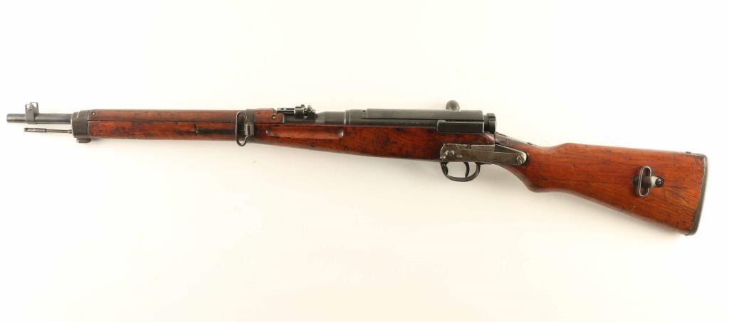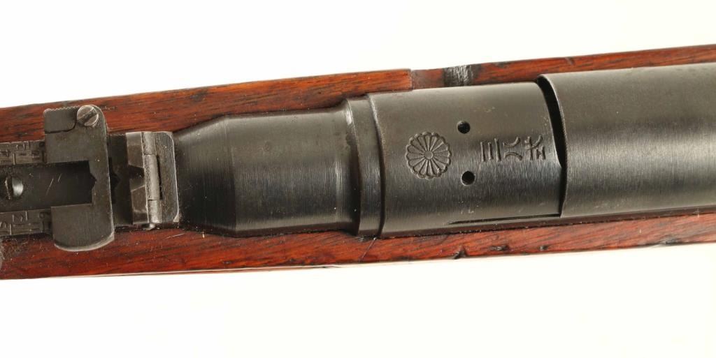6.5mm SN: 4906 'Fifth Series' Intact Mum. Very rare experimental Japanese military rifle, estimated only 200 manufactured. Based on a modified T-38 carbine, features 19" barrel, blade front sight with protector ears, V notch rear sight with flip-up elevator ladder, cleaning rod, bayonet lug, side mounted sling swivels, manual safety, detachable floorplate, sliding dust cover over action, hinge mechanism at wrist to allow folding to smaller size. Bore is good to very good condition, bright with even light frosting, strong rifling. Barrel, sights & action retain 80% blue, some bare metal at edges, where dust cover rubs, where bayonet was mounted. Dust cover retains 80% blue, with few spots of thin patina forming. Bottom metal and bands show brownish color, with some bare metal at edges. Stock hinge appears mostly bare metal with brown colored staining, some bluing retained in protected areas. Wood is very good condition overall with slight dings & dents, an area of shallow gouging around wrist, original finish mostly intact, thinning forward of rear band. Butt join is excellent with barely visible line. Stamped markings in metal are deep and crisp. No importer marks observed. Marked "O / 203" (with 3 stamped on top of 0) on upper & lower tang. Missing one wood screw from forward part of stock hinge. Condition is NRA Very Good *** C&R Firearm ***