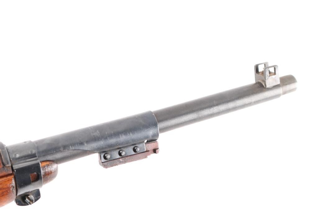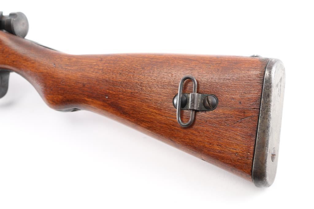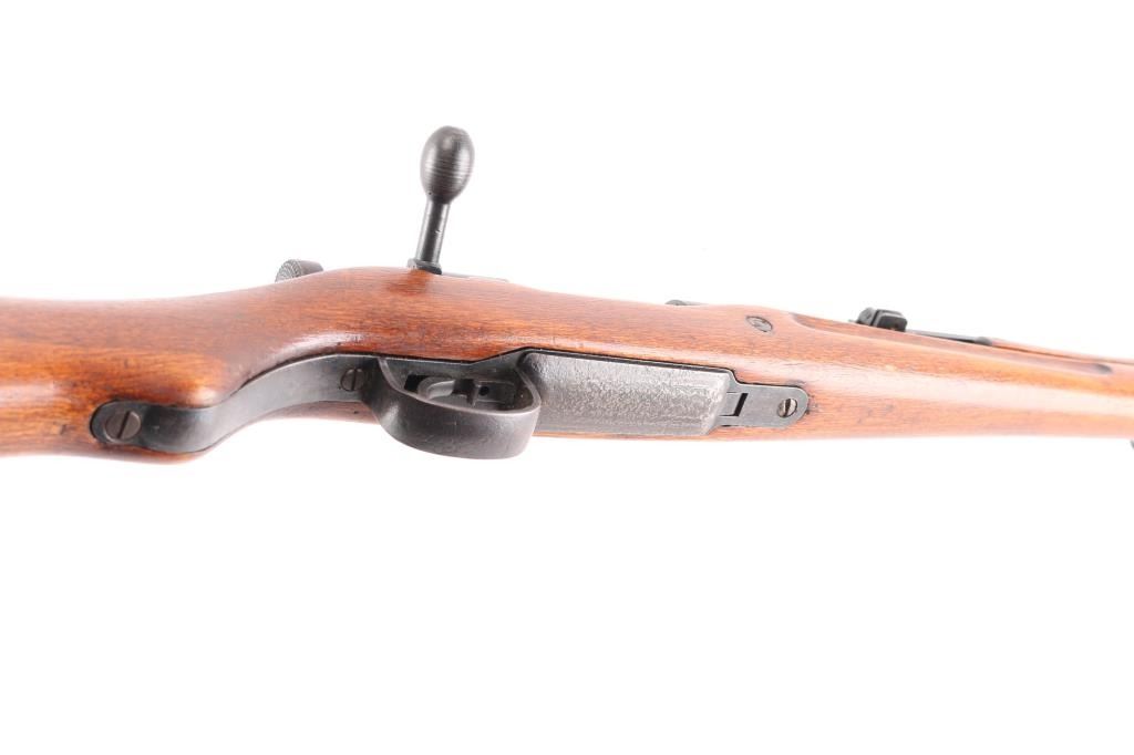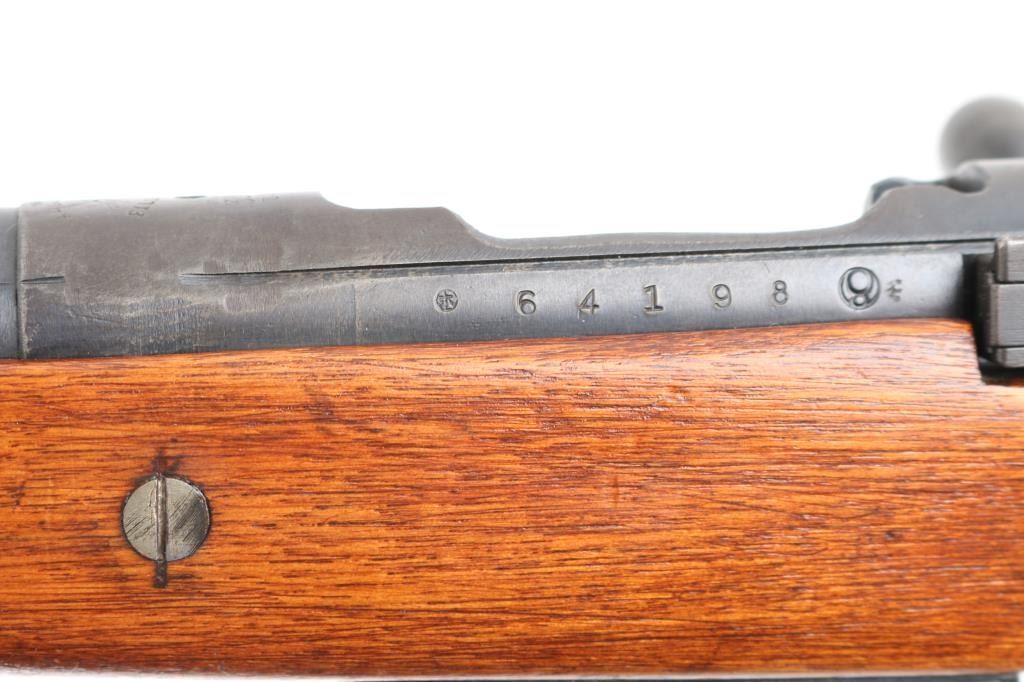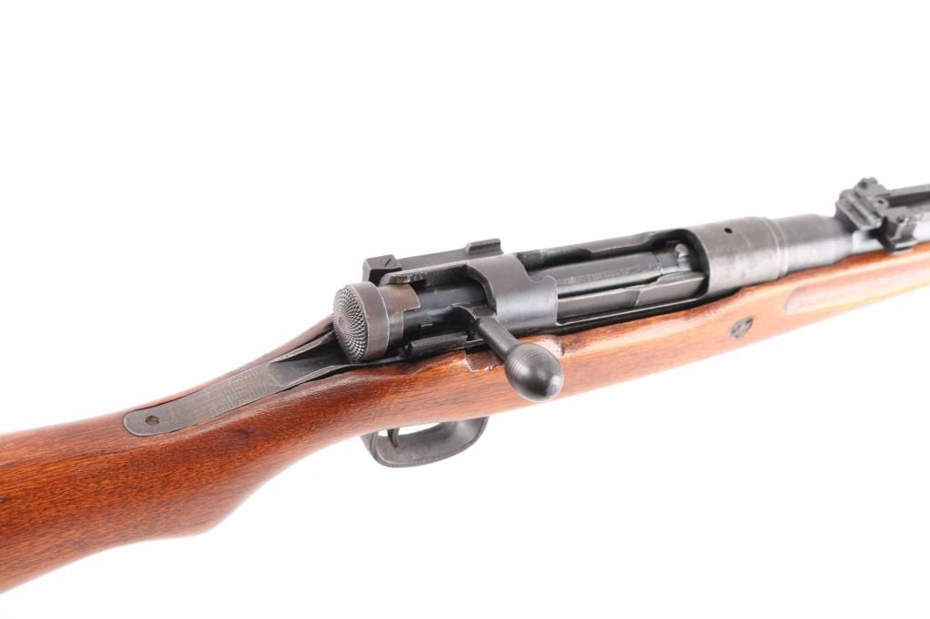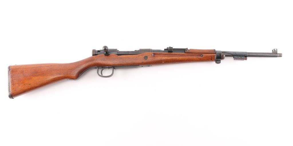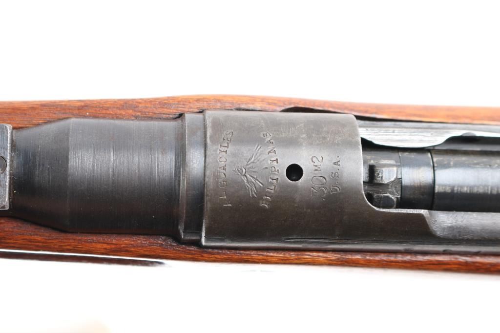 SN: 64198 Series 5 . Following the Second World War, The Philippine Constabulary primarily used captured Japanese rifles, most notably the Type 99 Arisaka rifles, which were seized from Japanese forces during the occupation of the Philippines. Modified type 99, 18:" barrel, original sights with the anti-aircraft wings removed, original Japanese serial numbers match on receiver, bolt, extractor and firing pin. Rechambered in 30-06. M1 carbine type 3 barrel band attached, (Poor job), Chamber scrubbed and stamped " Alguaciles Filipinas" with active volcano in the center. (Philippine Constabulary). Below that is small stamps of "30m2 U.S.A.". Bore is very good/bright with light frosting, wood is very good, markings are clear. A rare rifle.NRA condition-Good as Modified. C&R Firearm.