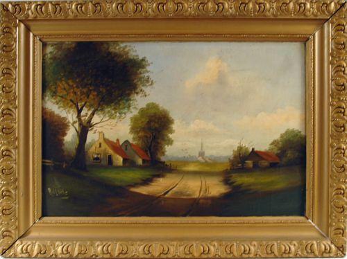 Naive oil on board, Country Lane with Church in Background, indistinctly signed lower left, 16" x 23.5", framed 22" x 30"