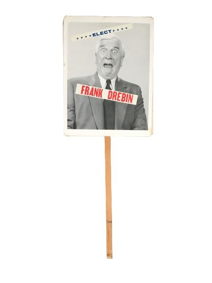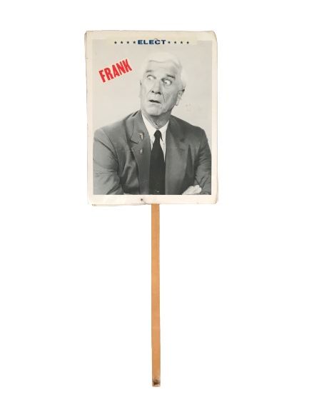 Naked Gun (1988) strike sign featuring Leslie Nielsen. This comes from a former employee of Paramount Pictures who obtained the prop from the props department while they were filming the movie. Oversized item. May be removed from wood stick to reduced shipping charges (4' tall x 18").
