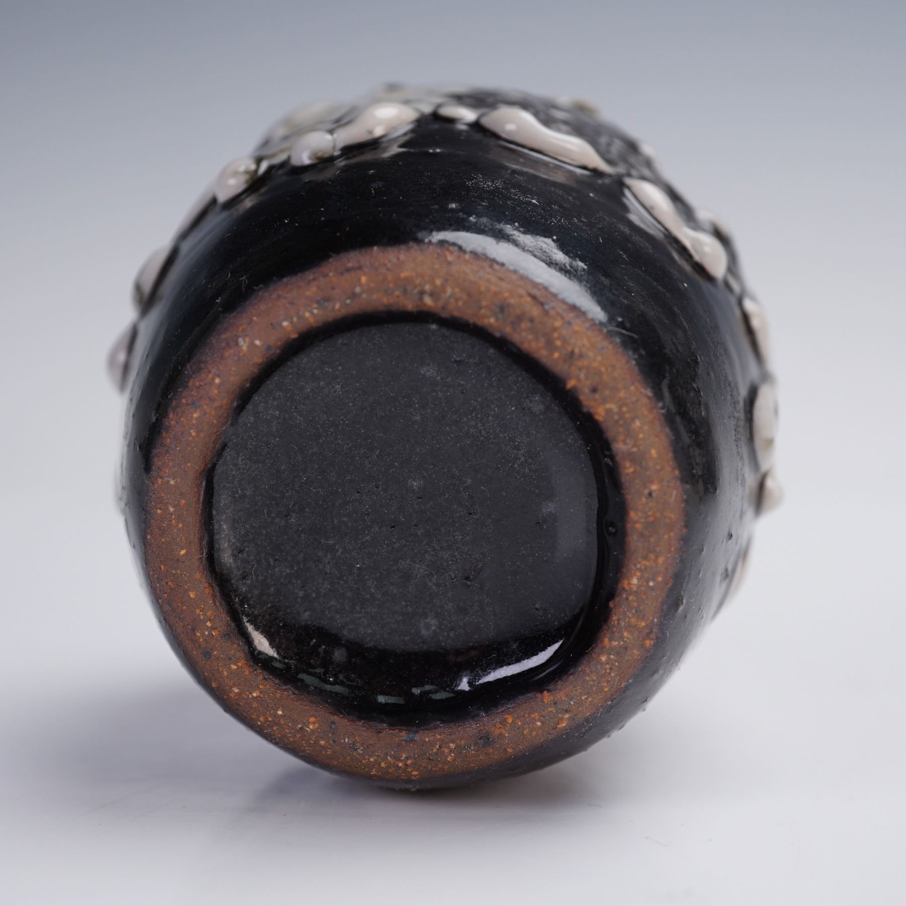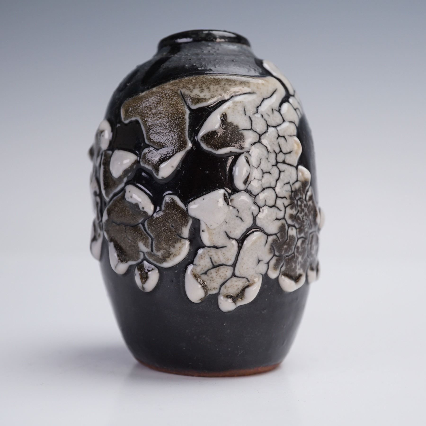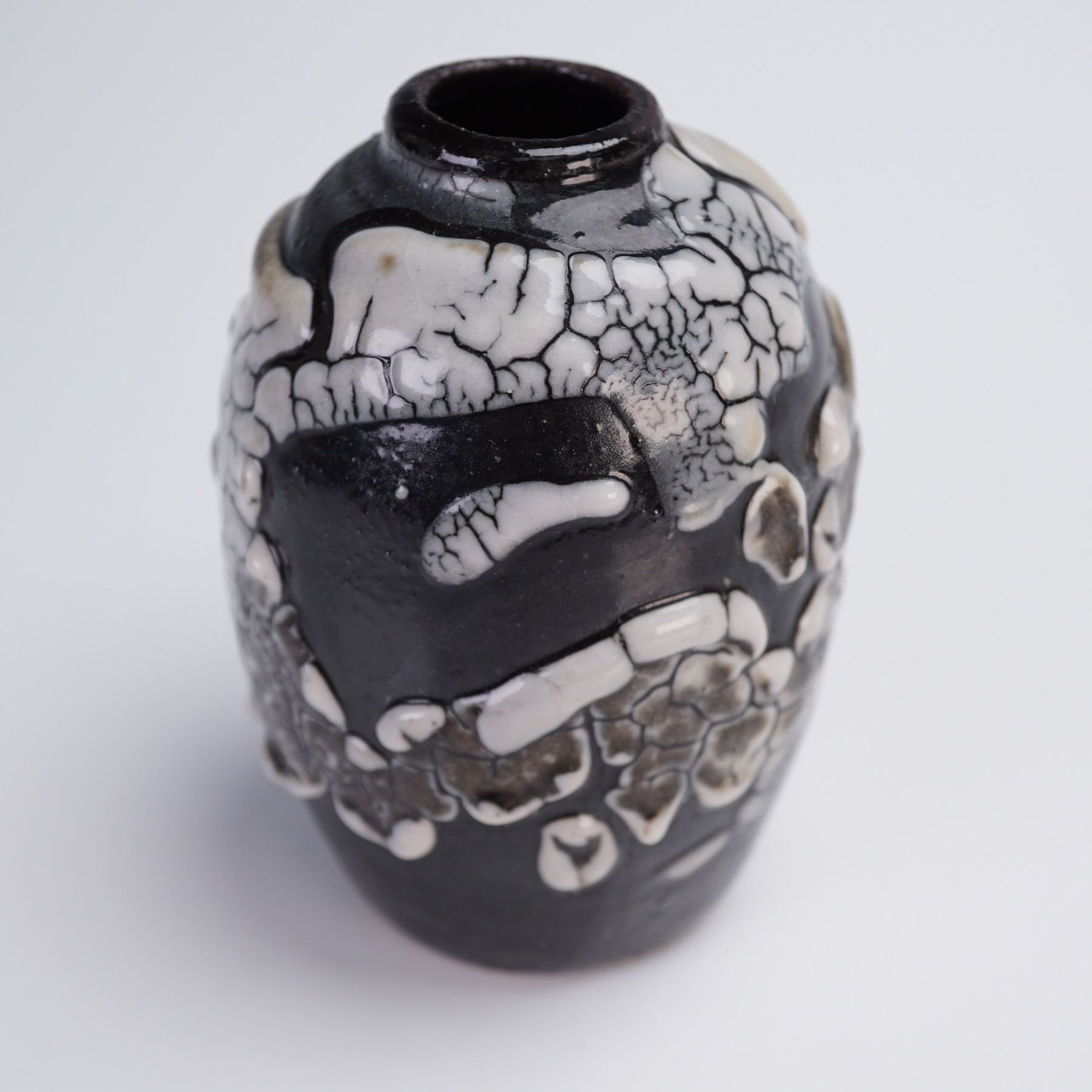 An extraordinary example of naked raku studio pottery, this vase features a rich black clay body that reveals a lively, white crackle net pattern and organic, almost petrified textured accents. The naked raku technique allows the clay's natural surface to emerge through controlled reduction and removal of glazes, creating a raw, elemental aesthetic. Hand-thrown and cooled to reveal its dramatic surface, the piece shows careful attention to form and finish. The foot shows the bare clay body, giving insight into its firing style.