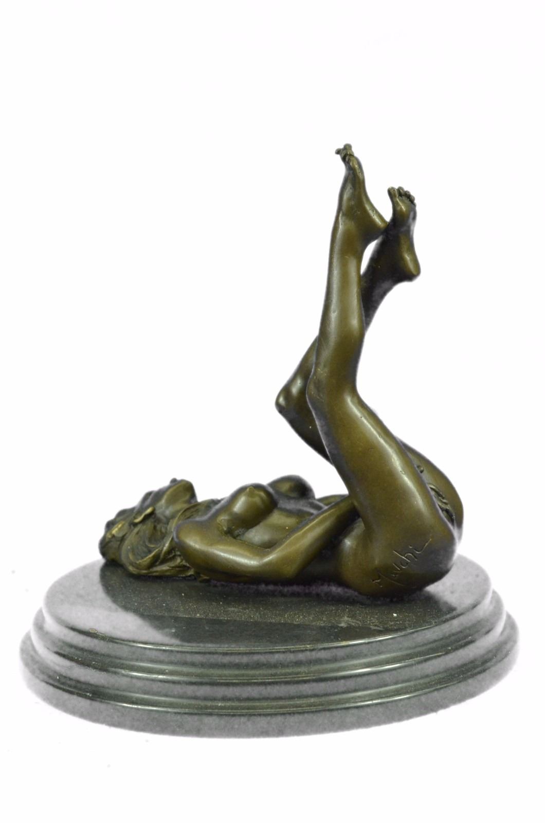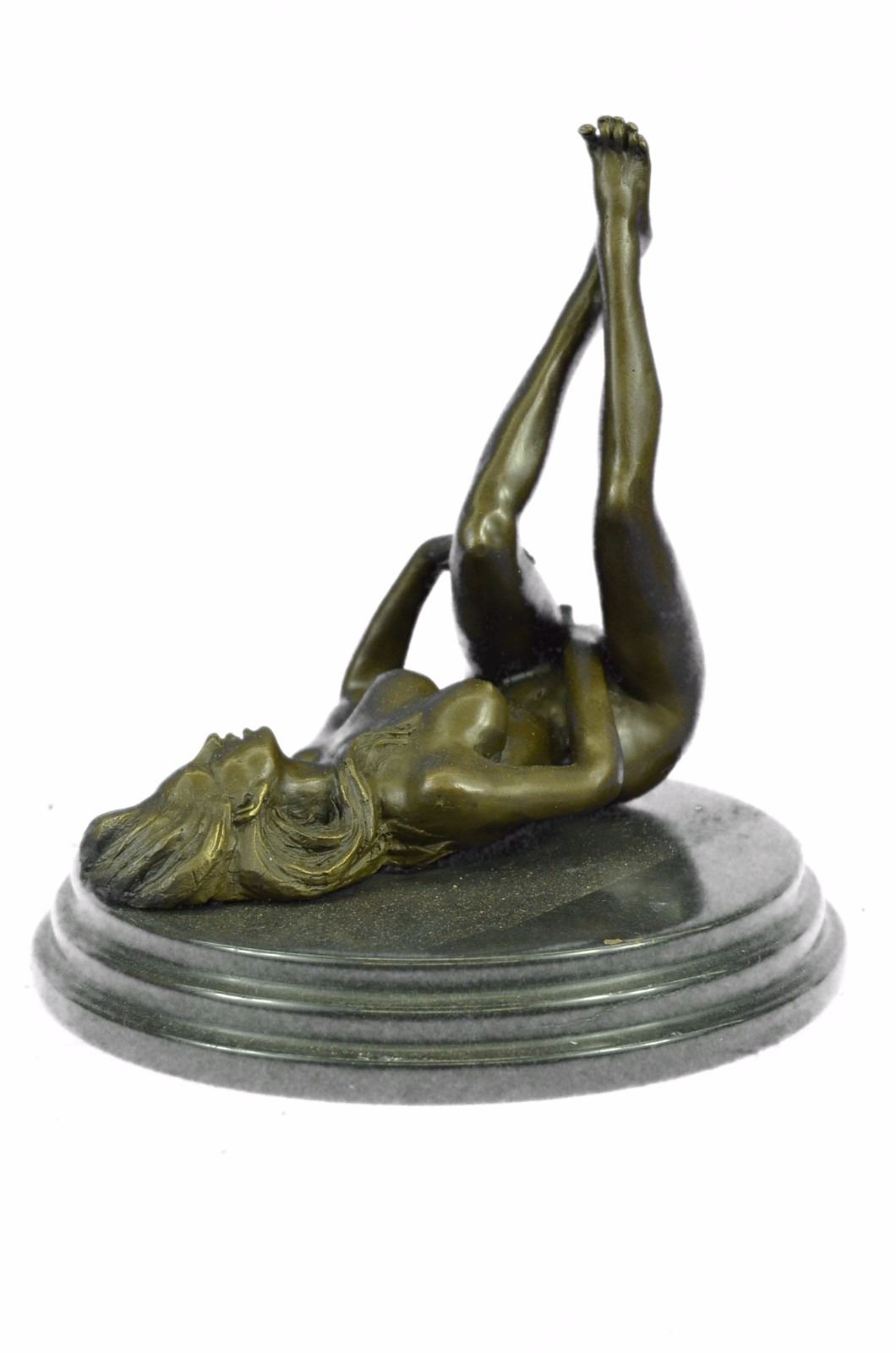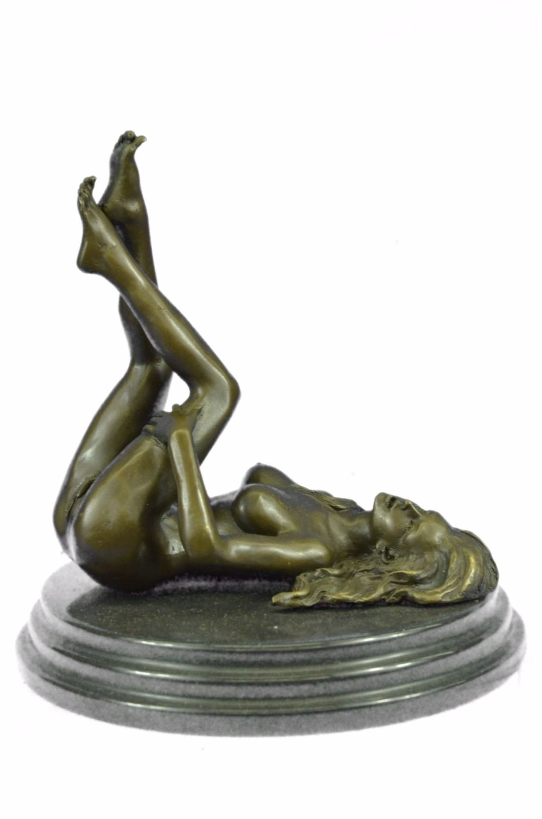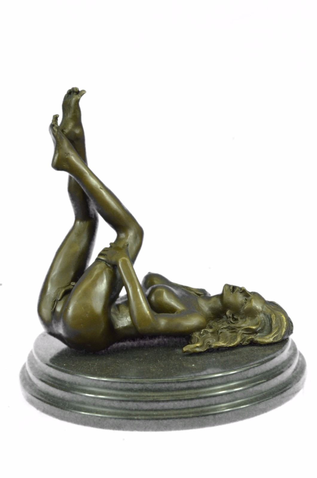 The nude seductress lies on the ground in the grasp of a feverish desire. The bronze sculpture, capturing woman sexuality, was cast using the early method of lost-wax casting and stained with a brown patina finish for preservation. She is mounted upon a black marble base. Bronze Dimensions with Marble Base: Height 8 X Width 8 inches. Weight: 8 LBS. Inventory: 49ST0614494