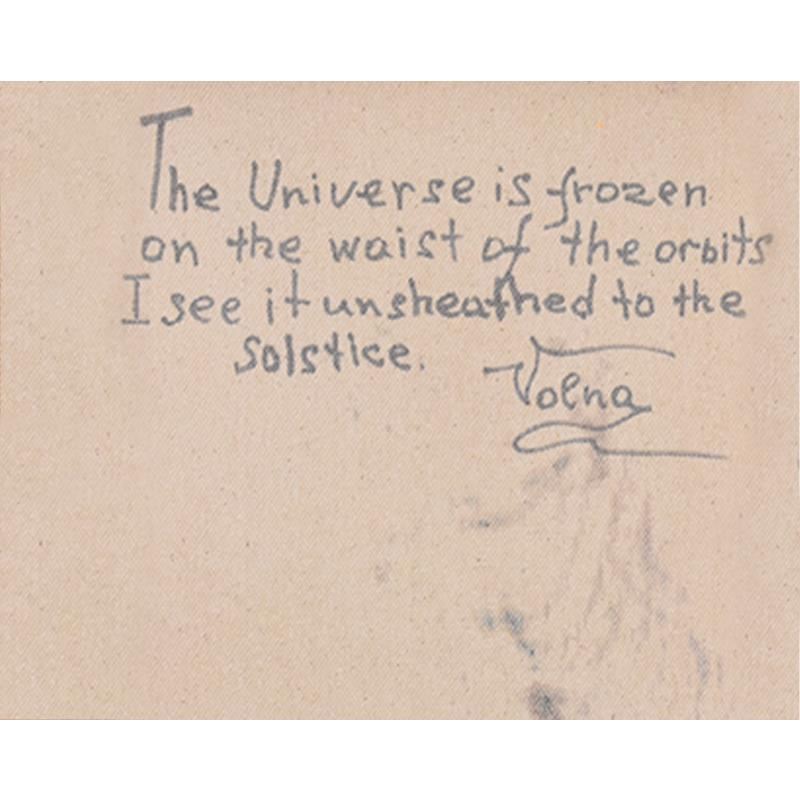 "Naked Universe" is an original acrylic painting on stretched canvas by Nadia Volna, hand signed by the artist. This piece is painted with light-reactive black light paint that reveals brilliant colors when viewed under incandescent light. This piece comes with a blacklight flashlight (batteries not included). This piece comes with a blacklight flashlight (batteries not included). Includes Letter of Authenticity. Measures approx. 24" x 36" (image).