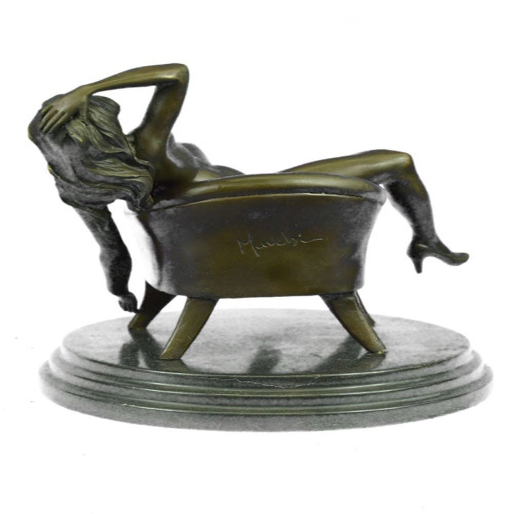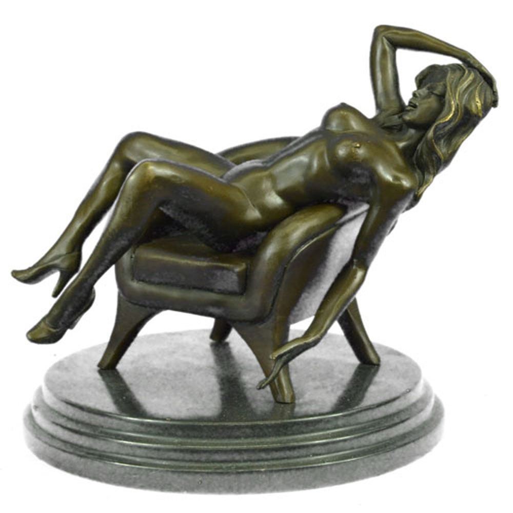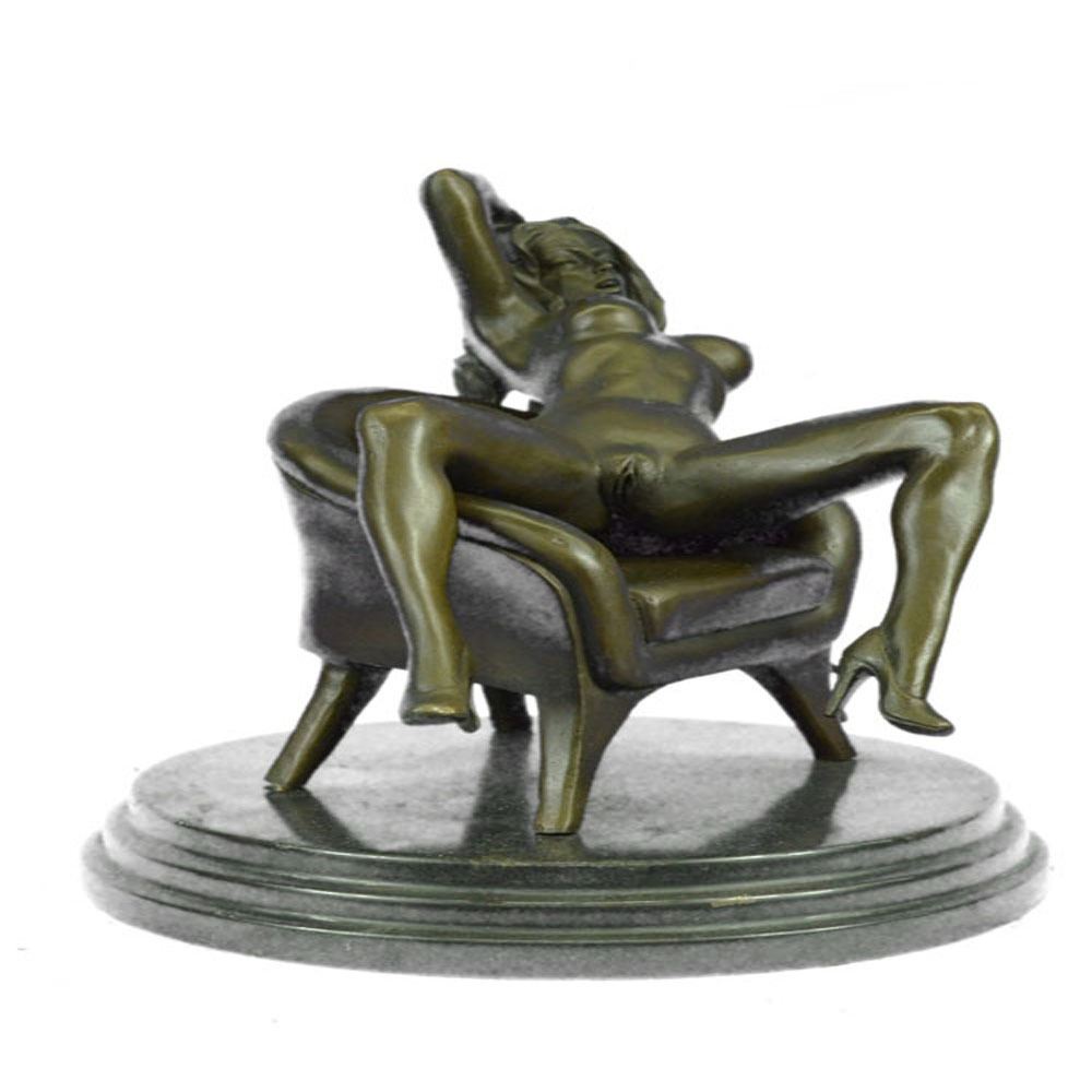 She sits side saddled on a sofa as the wind blows through her hair. She wears nothing and completely naked. Her breasts are exposed and her nipples are hard and pointy letting you know she is defiantly excited. This sculpture was cast using the Lost Wax Method and has a two toned brown patina. Bronze Dimensions with Marble Base: Height 8 X Width 8 inches. Weight: 10 LBS.