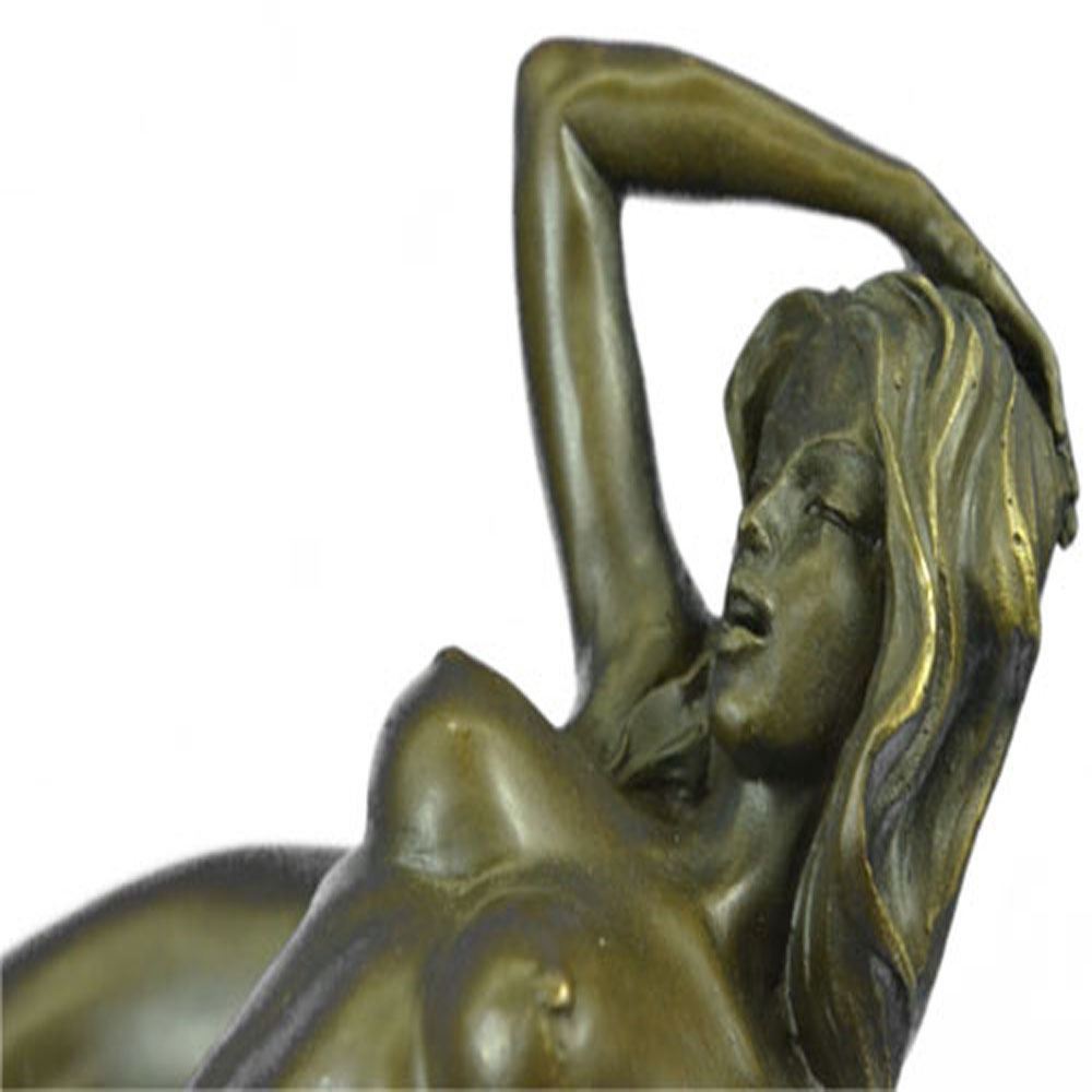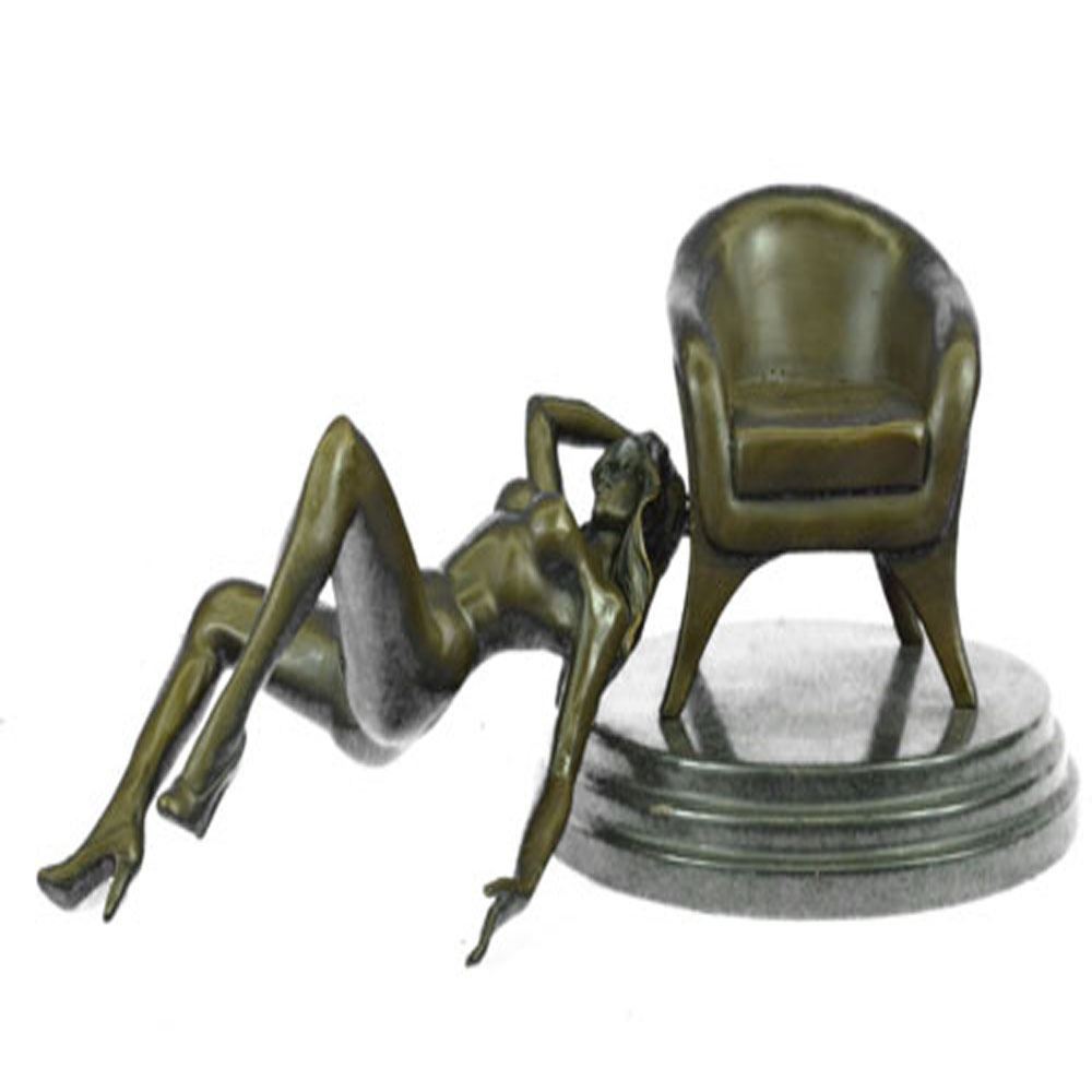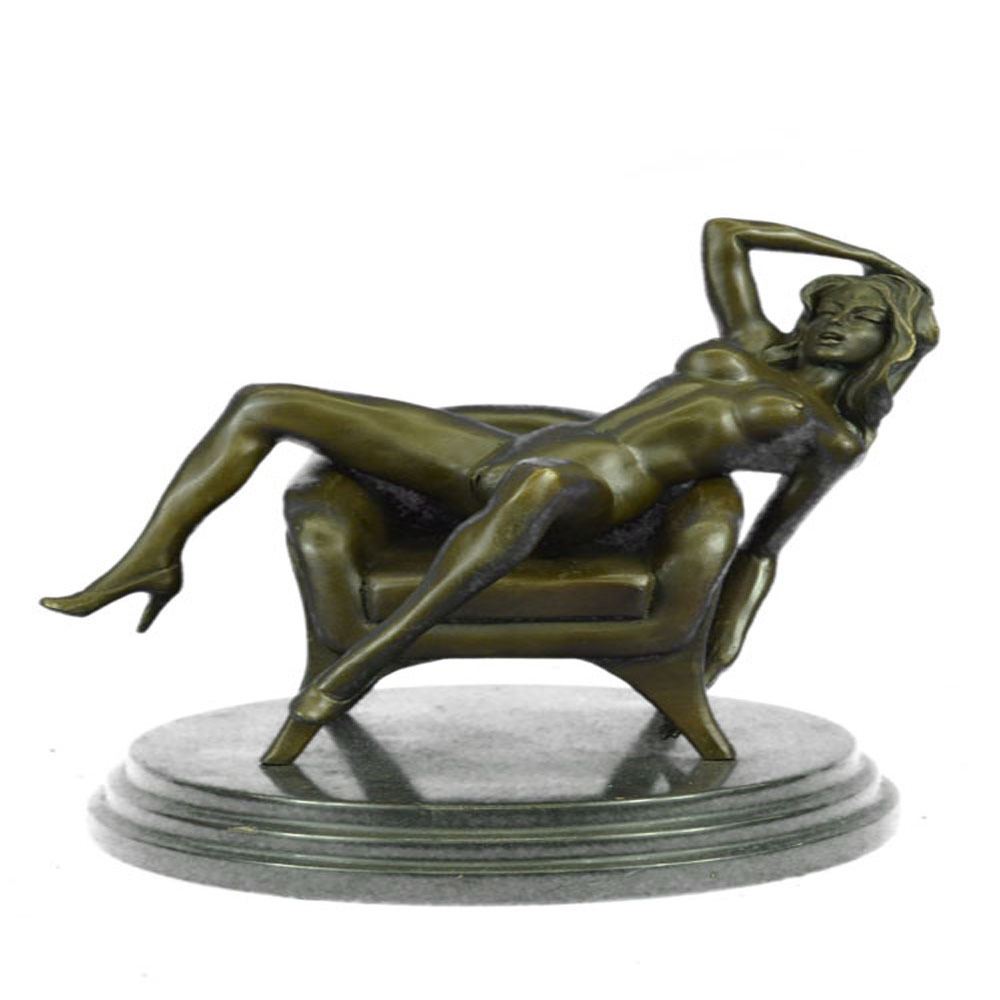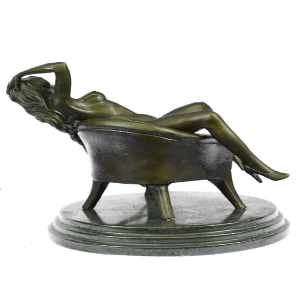 She sits side saddled on a sofa as the wind blows through her hair. She wears nothing and completely naked. Her breasts are exposed and her nipples are hard and pointy letting you know she is defiantly excited. This sculpture was cast using the Lost Wax Method and has a two toned brown patina. Bronze Dimensions with Marble Base: Height 8 X Width 8 inches. Weight: 10 LBS.