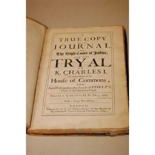 Nalson, J. [John]. A True Copy of the Journal of the High Court of Justice, For the Tryal of K. Charles I. As It Was Read in the House of Commons, and Attested Under the Hand of Phelps, Clerk to That Infamous Court. Taken By J. Nalson, LL D. Jan. 4, 1683. London: Printed By H.C. For Thomas Dring, 1684. First Edition. Folio - over 12" - 15" tall. Hard Cover. Ex-Library. Good Condition. With 3 plates - frontispiece with explanation, portrait of King Charles I and a plate of the courtroom with an explanation. 7 leaves, lxx, 2 leaves, 124pp, 3 leaves being An Alphabetical Catalogue of the Members of the High Court of Justice, 1 leaf of publisher's advertising. Pagination inconsistent - pg LXI on recto/LXIII on verso; also LXIV on recto/LXIV on verso; also 1-40, 45-124. Bound in leather (worn, chipped), with blind stamped borders, raised bands on spine. Hinges cracked, binding tight.