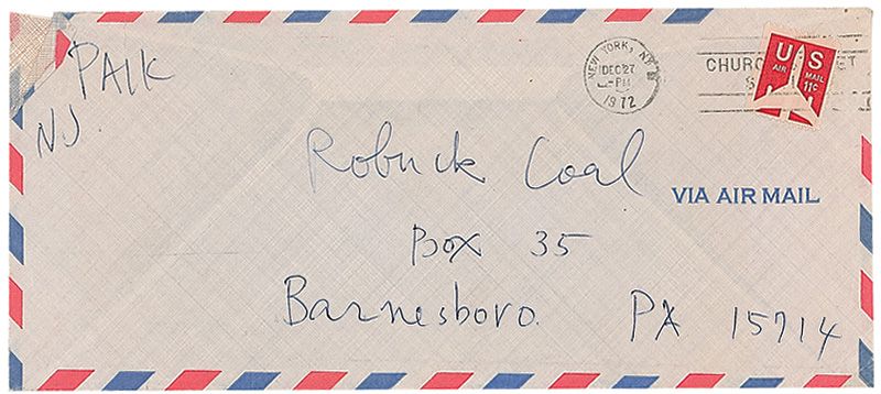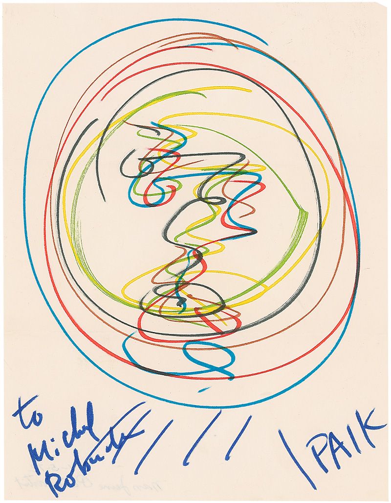Korean American artist (1932–2006) who worked in a wide array of media and is considered one of the first ‘video artists.’ Original signed and inscribed multicolored felt tip sketch on an off-white 8.5 x 11 sheet. Signed and inscribed, “To Michael Robuck, Paik.” In fine condition, with two horizontal folds and scattered wrinkles. Accompanied by the original mailing envelope addressed in Paik’s hand.