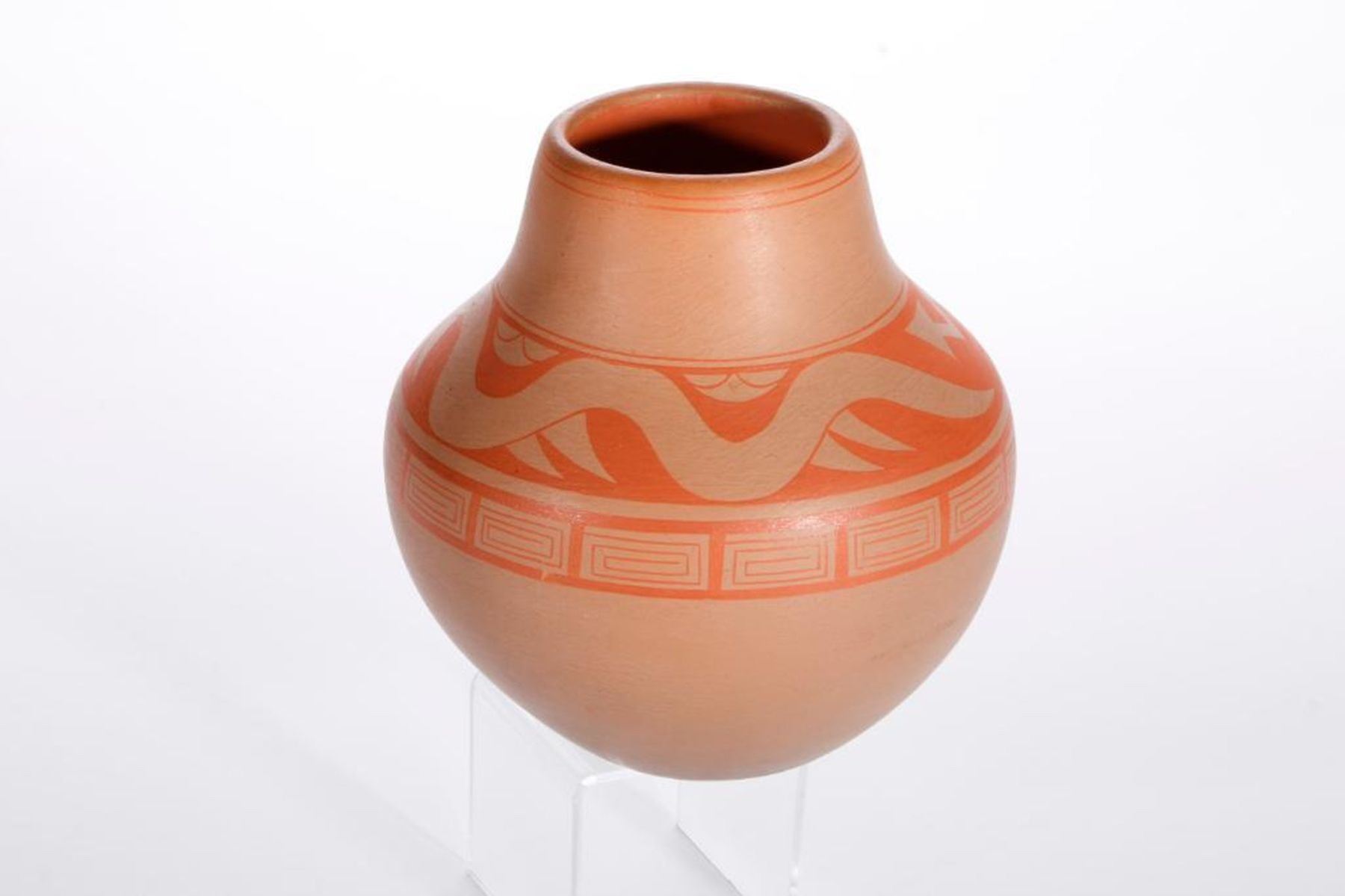 Nambe (7" x 8") pot, brown w/ painted orange avanu design; by Lonnie Vigil, bought at Babbitt Trading Post on San Ildefonso reservation