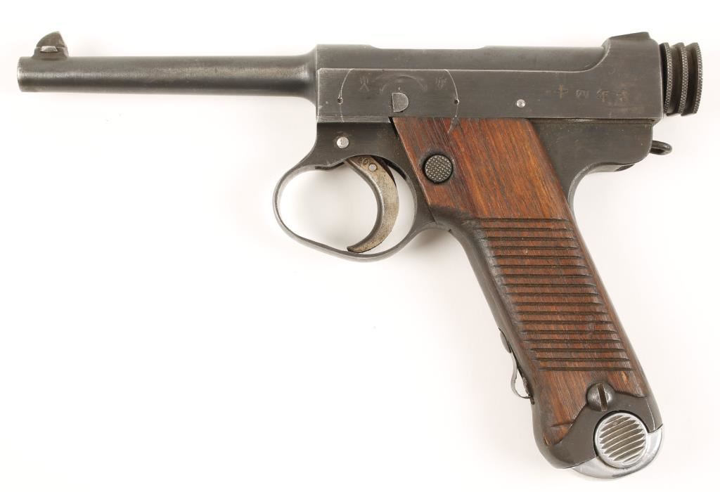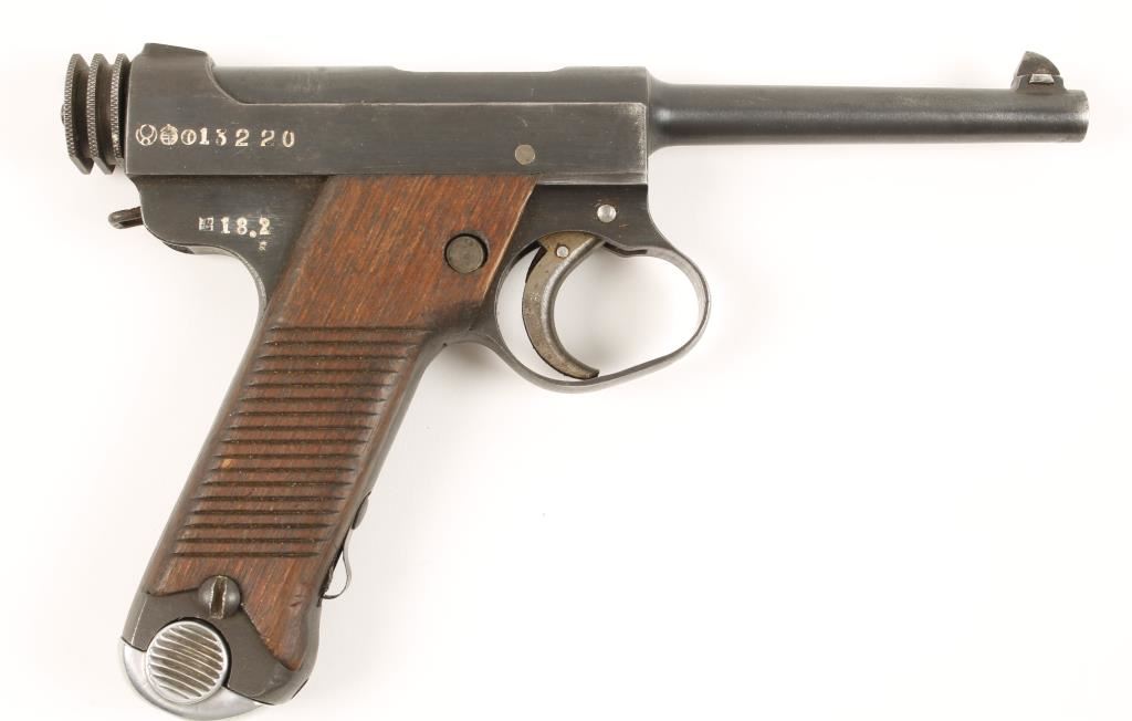Japanese single action hammerless semi-automatic pistol with a 4-1/2" barrel and one magazine not numbered to the gun. Made in Feb., 1943. Blued finish is dull with edge wear and has safety lever "ring". The safety lever is broken. Bore has rifling and some dark areas. Grips have 17 grooves and are in good condition. Function is good. Condition is fair to good. *Modern Firearm*