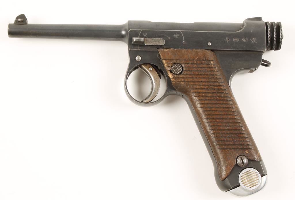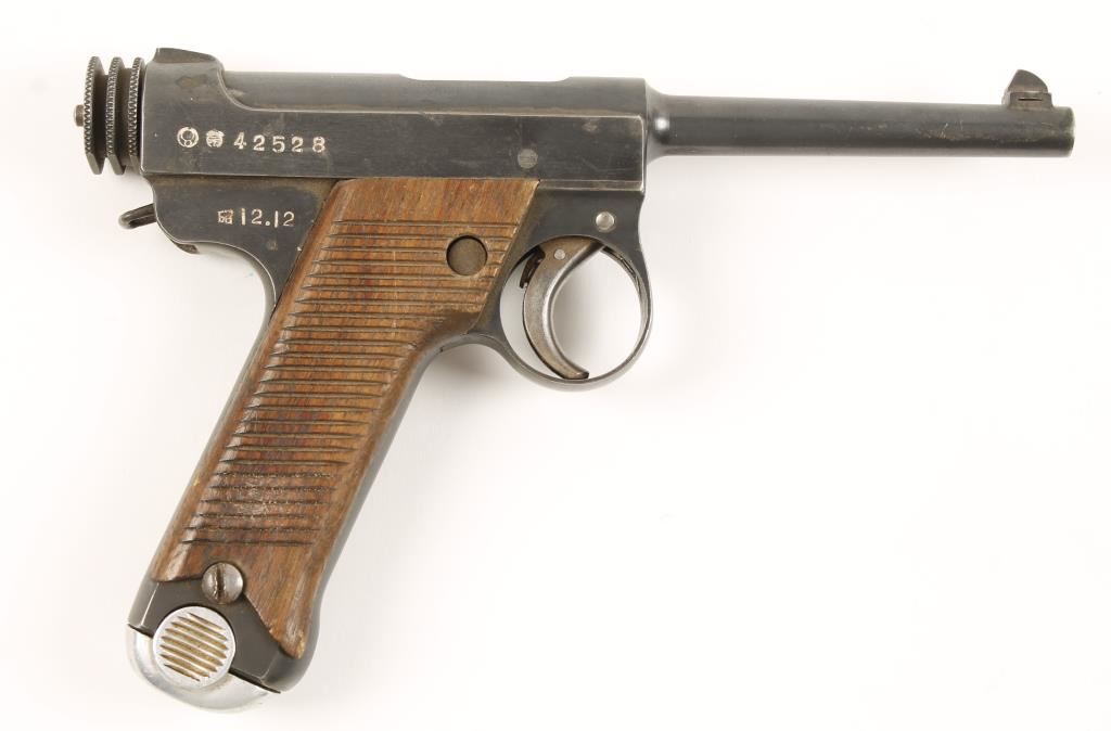 Blued single-action hammerless semi-automatic pistol with a 4-1/2" barrel and one non-matching magazine. Made in December, 1937. Finish has slight edge wear and the scratch from the safety. Wood grips have 25 grooves and the left is missing a chip in front of the mag release. The bore has frosty rifling. The action is fine. Condition is very good. *Modern Firearm*