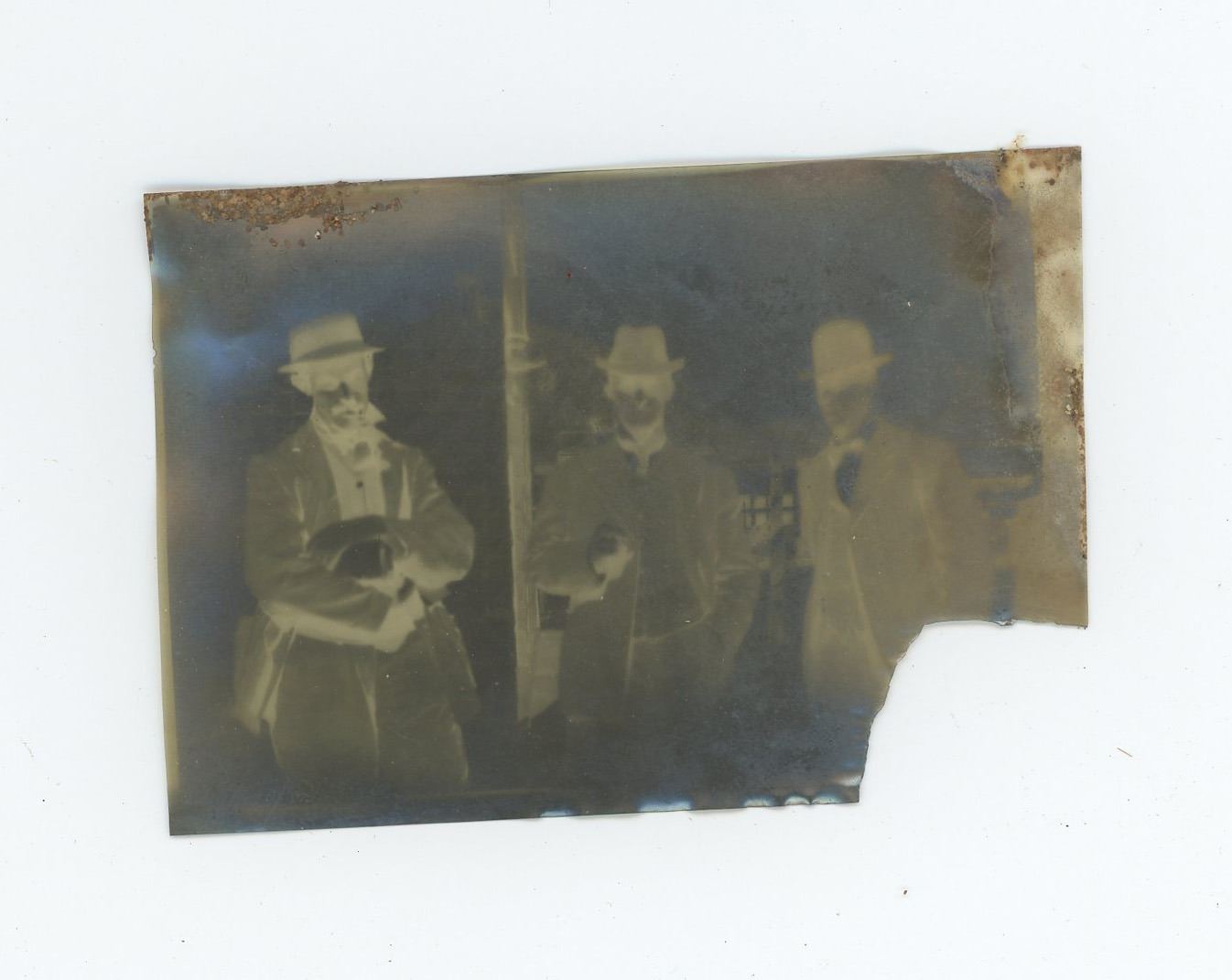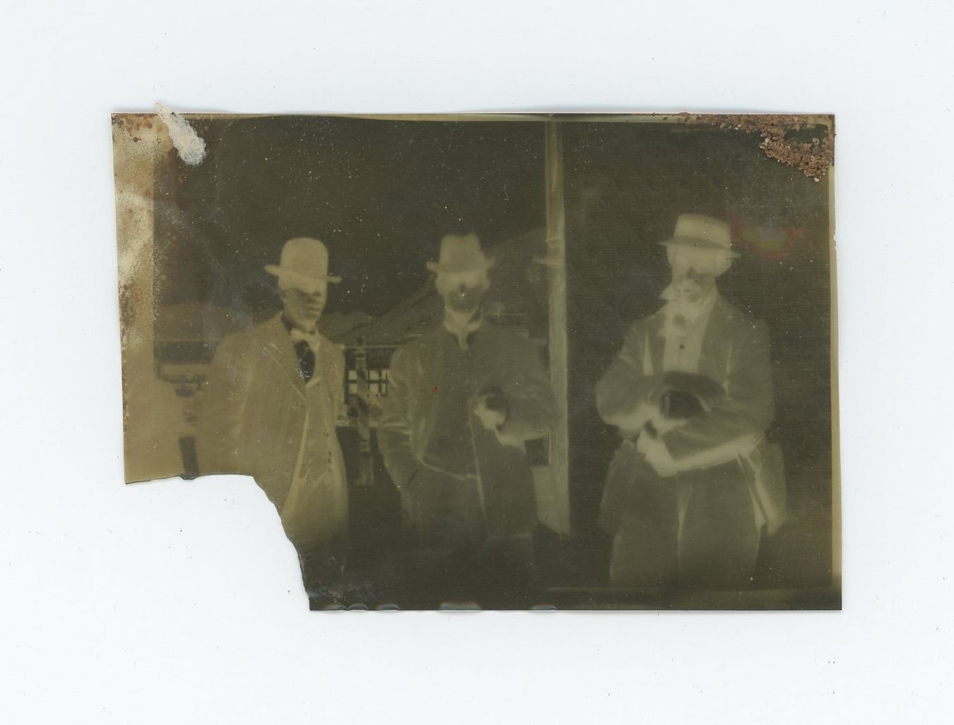 3 3/8" by 2 3/8". In December 1906, prospector Jim Swanson made a discovery of a rich gold and silver deposit in the hills near what became Rawhide. He was soon joined by Charles ("Charley") B. Holman and Charles ("Scotty") A. McLeod, who also found sizeable deposits nearby on Hooligan Hill. McLeod had recently been ordered to cease prospecting around the nearby camp of Buckskin, and bitter about this, he suggested the name of Rawhide for the new camp, as a play on the name of the Buckskin camp he held with contempt. Word spread, and both Holman and McLeod sold their claims to investors and moved on to Stingaree Gulch later in 1907, where they found yet another large deposit. The two men sold these claims for even more money, and then left the area to prospect elsewhere. The frenzy that these claims created soon had Rawhide booming. Investors began selling stocks at a frenetic pace, and the town soon had a population of about 5,000, with: three banks, four churches, a school, twelve hotels, twenty-eight restaurants, a theater, and thirty-seven saloons. While the original mines and claims did produce a decent profit in gold and silver, the fever created an amount of activity far in excess of what the mines could support. Stock swindlers like George Graham Rice, a flashy con-artist from Goldfield, plied their trade, creating a sense that Rawhide would be the next Virginia City (or the like of any number of other Nevada boom towns), with untold riches to be had for the savvy folks who would just invest in his companies. Others, like businessman George "Tex" Rickard came to Rawhide to establish legitimate businesses, and make money off the boom while it lasted. Rawhide's hey-day was short-lived; the glaring, gross over-promotion which manipulators performed to inflate the worth of Rawhide doomed its chance for success from the start. In the short span of two years the town went from its peak population of 7,000 people (March to June, 1908), to fewer than 500 people by the latter part of 1910. Helping push the decline of the town even further along was a disastrous fire which swept through Rawhide in September 1908, along with a flood in September 1909, from which many people did not recover or rebuild. While the original mines worked out the last of the gold and silver from the veins first discovered by Swanson, Holman, and McLeod, people began to leave the area, moving to the next "big thing". While there remained a few people eking out a life working in the mines, or processing the ore, or just working their own claims and prospecting, for all intents and purposes the town became a hollow shell of what it once was. The population was 32 in 1940.