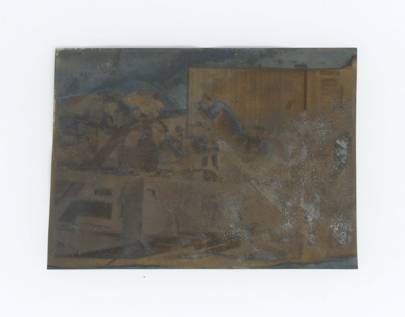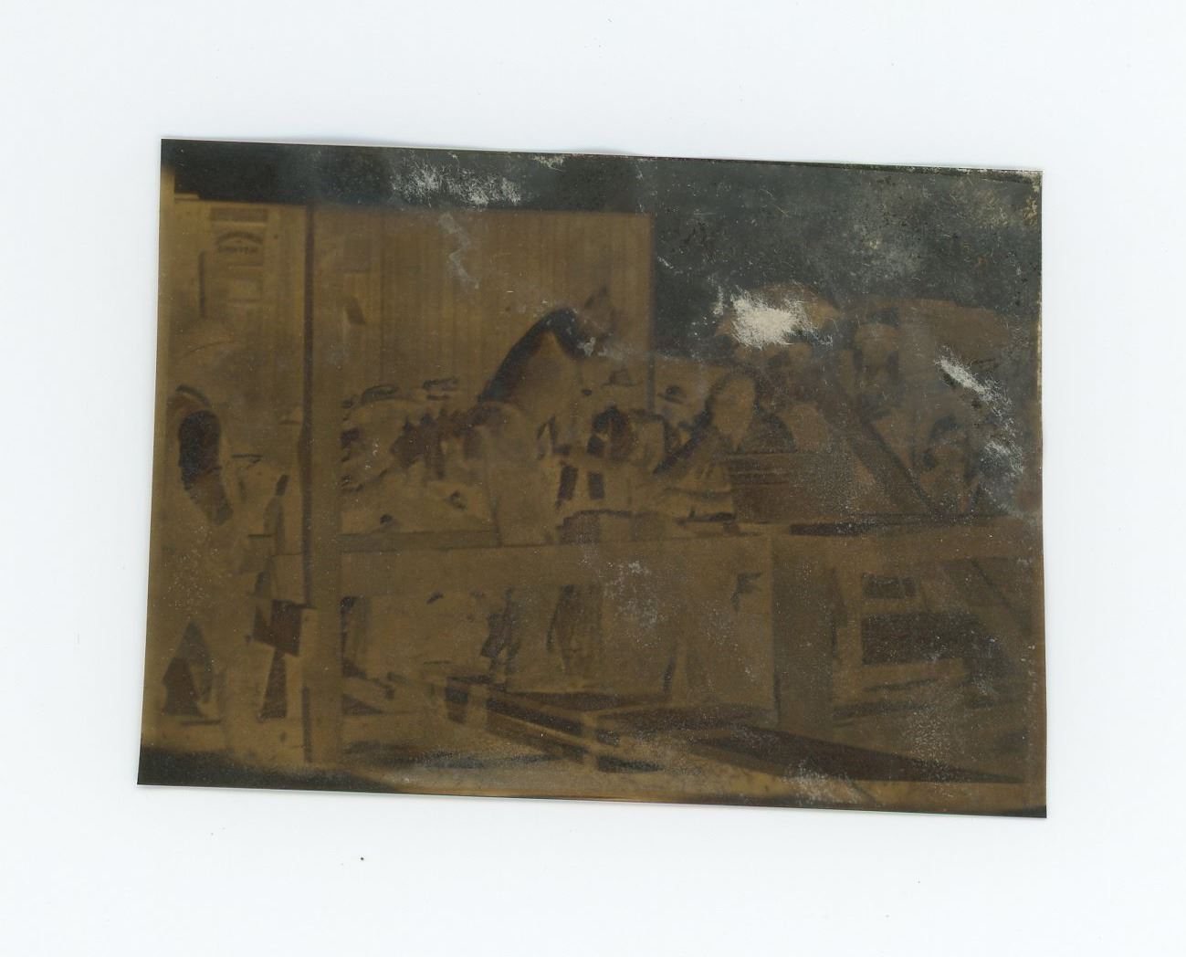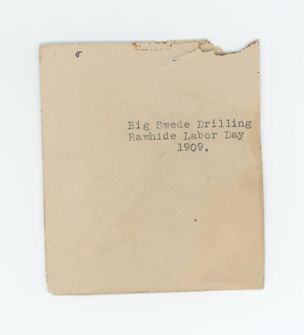 Photo Negative of Big Swede Drilling on Labor day in gold boomtown. 3 1/4" by 2 3/8". In December 1906, prospector Jim Swanson made a discovery of a rich gold and silver deposit in the hills near what became Rawhide. He was soon joined by Charles ("Charley") B. Holman and Charles ("Scotty") A. McLeod, who also found sizeable deposits nearby on Hooligan Hill. McLeod had recently been ordered to cease prospecting around the nearby camp of Buckskin, and bitter about this, he suggested the name of Rawhide for the new camp, as a play on the name of the Buckskin camp he held with contempt. Word spread, and both Holman and McLeod sold their claims to investors and moved on to Stingaree Gulch later in 1907, where they found yet another large deposit. The two men sold these claims for even more money, and then left the area to prospect elsewhere. The frenzy that these claims created soon had Rawhide booming. Investors began selling stocks at a frenetic pace, and the town soon had a population of about 5,000, with: three banks, four churches, a school, twelve hotels, twenty-eight restaurants, a theater, and thirty-seven saloons. While the original mines and claims did produce a decent profit in gold and silver, the fever created an amount of activity far in excess of what the mines could support. Stock swindlers like George Graham Rice, a flashy con-artist from Goldfield, plied their trade, creating a sense that Rawhide would be the next Virginia City (or the like of any number of other Nevada boom towns), with untold riches to be had for the savvy folks who would just invest in his companies. Others, like businessman George "Tex" Rickard came to Rawhide to establish legitimate businesses, and make money off the boom while it lasted. Rawhide's hey-day was short-lived; the glaring, gross over-promotion which manipulators performed to inflate the worth of Rawhide doomed its chance for success from the start. In the short span of two years the town went from its peak population of 7,000 people (March to June, 1908), to fewer than 500 people by the latter part of 1910. Helping push the decline of the town even further along was a disastrous fire which swept through Rawhide in September 1908, along with a flood in September 1909, from which many people did not recover or rebuild. While the original mines worked out the last of the gold and silver from the veins first discovered by Swanson, Holman, and McLeod, people began to leave the area, moving to the next "big thing". While there remained a few people eking out a life working in the mines, or processing the ore, or just working their own claims and prospecting, for all intents and purposes the town became a hollow shell of what it once was. The population was 32 in 1940.
