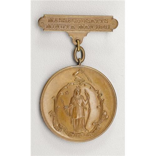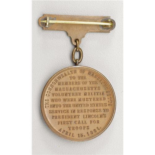 <B>Named Massachusetts 1861 Minutemen or “First Call” Medal.</B></I> A beautifully struck bronze medal, 1.5” in diameter, inscribed along rim “Samuel H. Phillips, Prvt.B.8th.Reg", suspended from a pendant reading “Massachusetts Minute Men 1861”. The obverse depicts the seal of the Commonwealth of Massachusetts; the reverse “To the members of the Massachusetts Volunteer Militia who were mustered into the United States service in response to President Lincoln's first call for troops April 15, 1861.” Samuel Phillips was a resident of Marblehead, Massachusetts and enlisted on April 15, 1861, as a private. He served in "B" Company of the 8th Massachusetts Infantry as well as Company "A" of the 4th Massachusetts Heavy Artillery. Fine condition.<BR><BR><b>Shipping:</b> Miscellaneous Collectibles, Smal (<a target="_blank" href="http://www.heritageauctions.com/common/shipping.php">view shipping information</a>)