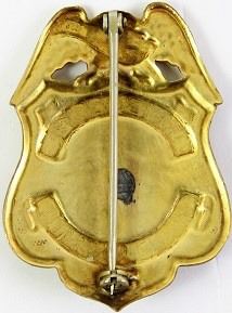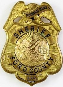 Named eagle shield badge Ford CountyDodge City Sheriff Howard King 1894-1950, included are 2 copies of Dodge City newspapers recording King as Chief of Police in 1921, and Sheriff as of 1927, also reporting the killing of JE Cox Chief ofPolice, by a fugitive named John Waycoff. Sheriff King and posse were responsible for the manhunt tracking the gunman down and in a "thrilling gun duel" was riddled with bullets and killed outside of Dodge City.Third of copy of Howard King's obituary. Oct. 16, 1950, 56 years old. Badge is unmarked on reverse with pin and burgess catch, made of solid gold colored metal with center seal in untested bright gold. 2 1/4". Est. 400-800