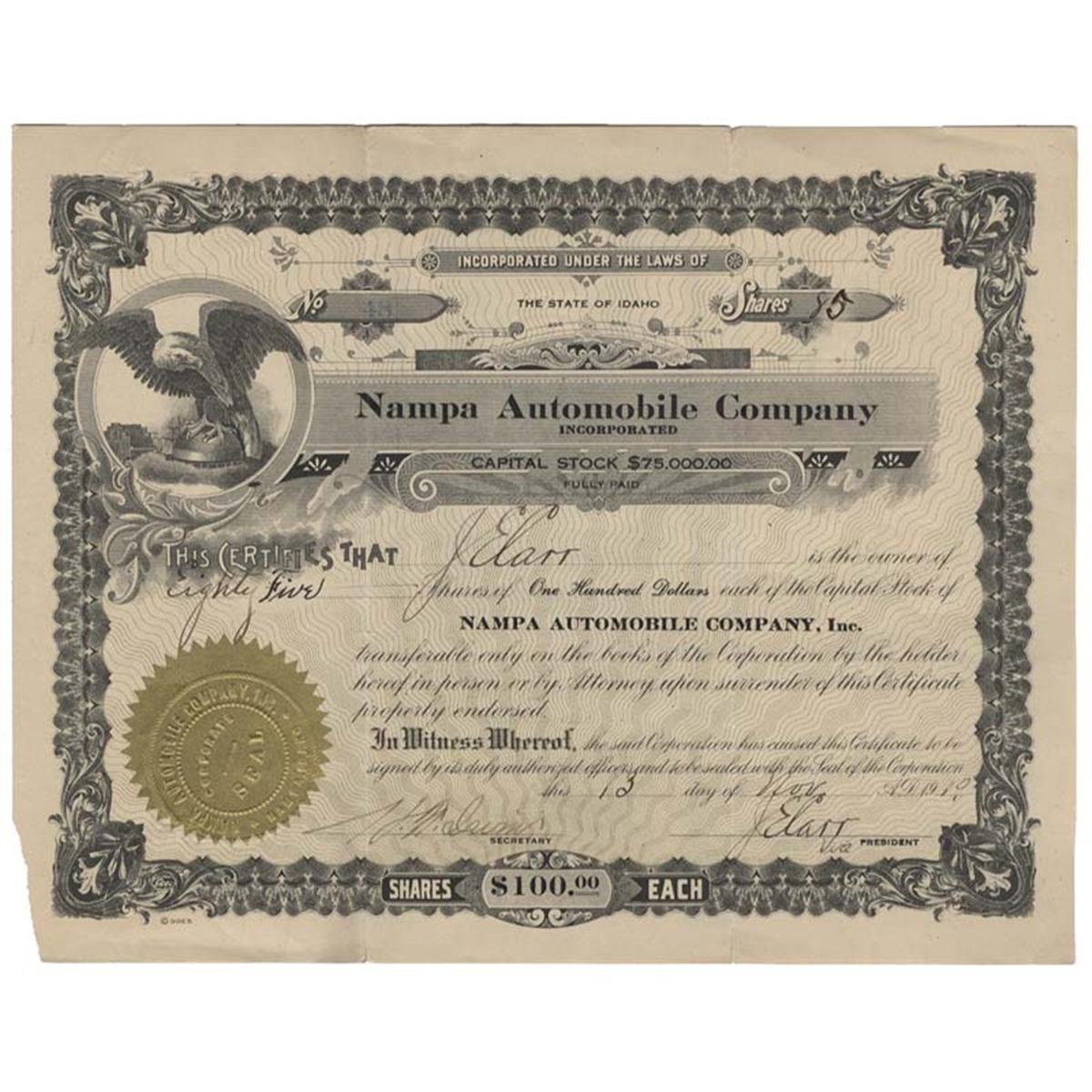 1910, Idaho. Stock certificate for 85 shares. Black/Gold. Eagle vignette in upper left corner. Litho. We found no manufacturing record, possibly a dealership. Small loss of paper at lower left corner. Uncancelled and Fine.