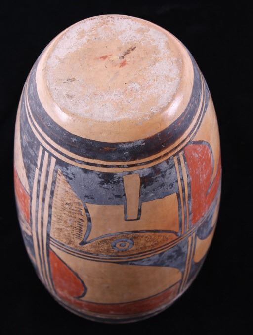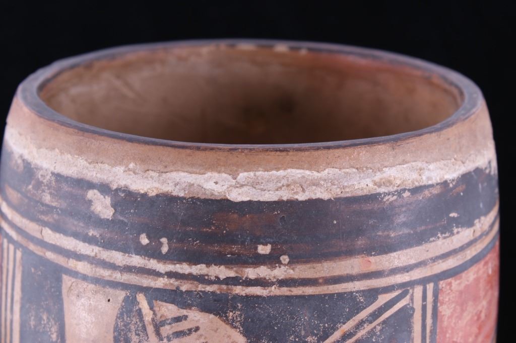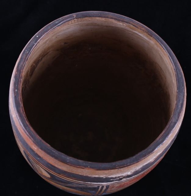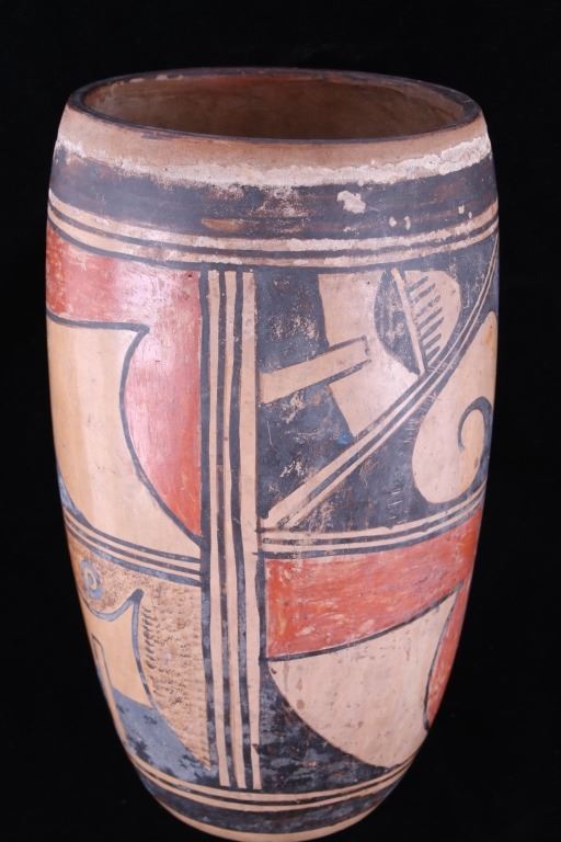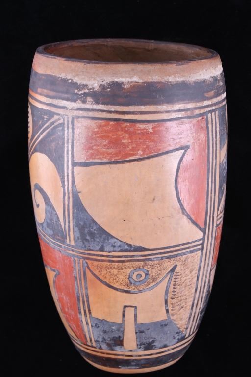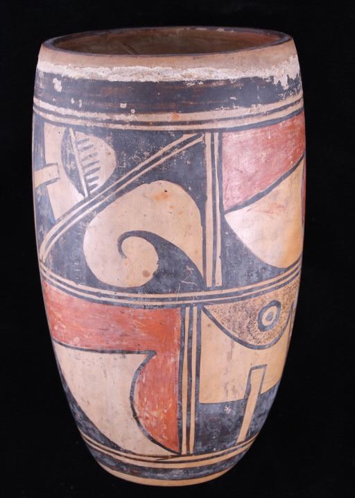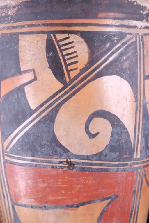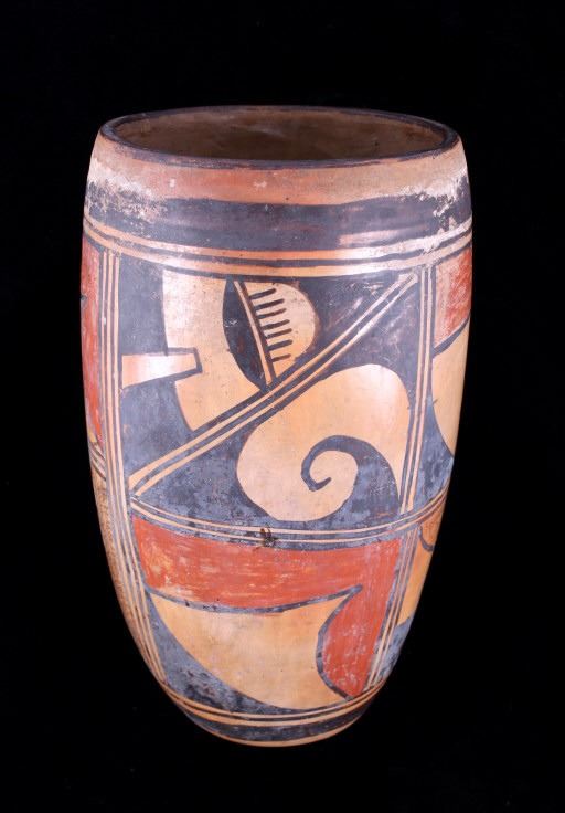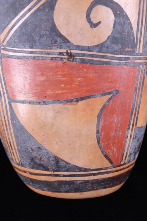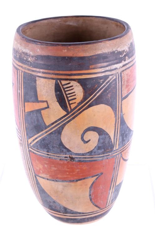 This is an outstanding authentic early Hopi pottery polychrome jar attributed to renowned master potter Old Lady Nampeyo of Hano (Hopi, 1859-1942). The jar dates to late 19th Century early 20th Century. Provenance: From a 90-year collection out of Central Arizona in the Coconino National Forest. The piece shows a fantastic three-color polychrome geometric traditional pigment painted design with unique no shoulder olla tall pottery jar. Nampeyo (Tewa name Num-pa-yu, meaning “snake that does not bite”) was a Hopi-Tewa potter who is one of the most renowned master of her era with works in the National Museum of American Art, Museum of Northern Arizona, Spurlock Museum and the Peabody Museum of Archaeology and Ethnology at Harvard University. The piece shows a wonderfully executed geometric finely stylized pattern of red, brown and black all displayed on a cream-colored slip background. The piece shows wear and signs of use consistent with its very early age. The works show the correct manufacture and fine craftsmanship along with being unmarked, which is consistent with other authentic Nampeyo pieces of an early age such as this piece. The piece is of a nice large size and shows an overall good condition with no visible cracks or chips with slight paint loss and pitting at the top edge. Measures overall 8.5”H by 5.25”W diameter. Shown are several digital photographs of Nampeyo which are not included.