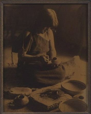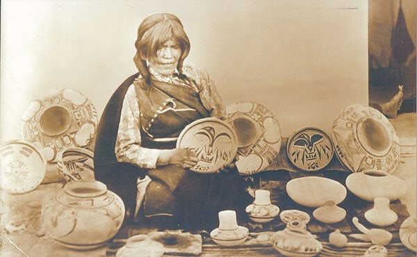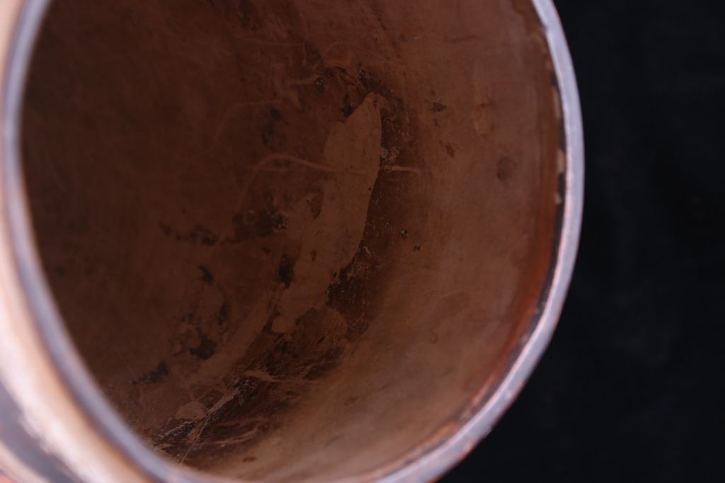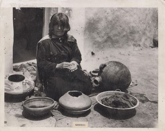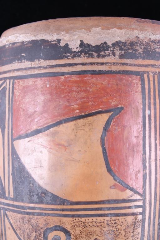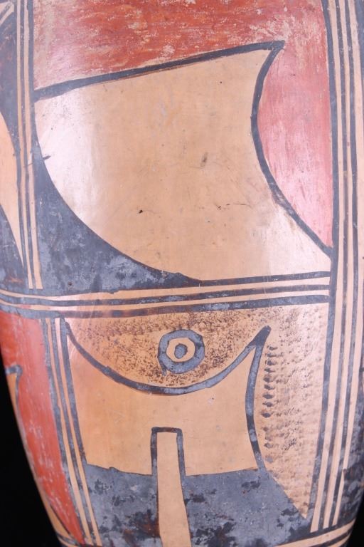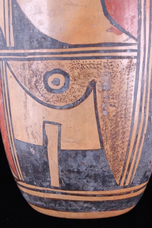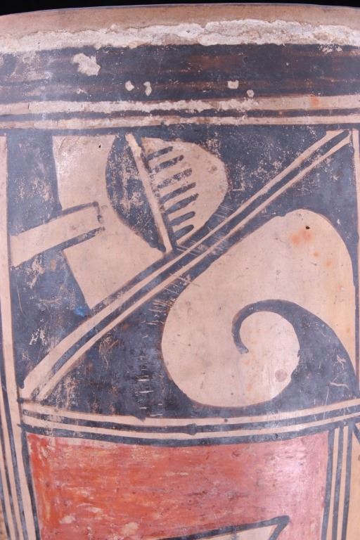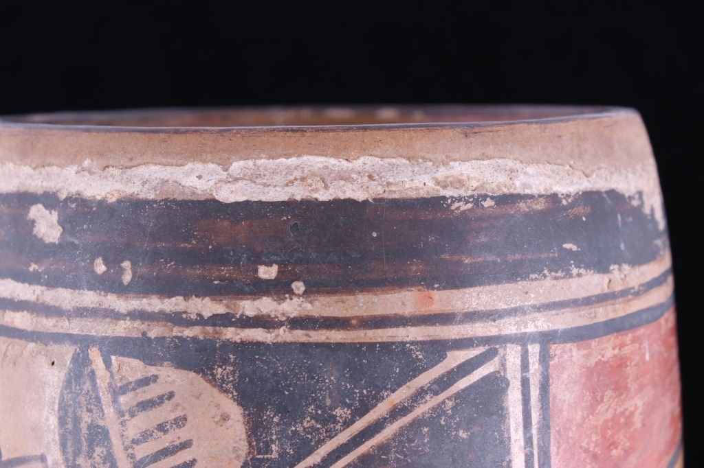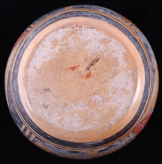 This is an outstanding authentic early Hopi pottery polychrome jar attributed to renowned master potter Old Lady Nampeyo of Hano (Hopi, 1859-1942). The jar dates to late 19th Century early 20th Century. Provenance: From a 90-year collection out of Central Arizona in the Coconino National Forest. The piece shows a fantastic three-color polychrome geometric traditional pigment painted design with unique no shoulder olla tall pottery jar. Nampeyo (Tewa name Num-pa-yu, meaning “snake that does not bite”) was a Hopi-Tewa potter who is one of the most renowned master of her era with works in the National Museum of American Art, Museum of Northern Arizona, Spurlock Museum and the Peabody Museum of Archaeology and Ethnology at Harvard University. The piece shows a wonderfully executed geometric finely stylized pattern of red, brown and black all displayed on a cream-colored slip background. The piece shows wear and signs of use consistent with its very early age. The works show the correct manufacture and fine craftsmanship along with being unmarked, which is consistent with other authentic Nampeyo pieces of an early age such as this piece. The piece is of a nice large size and shows an overall good condition with no visible cracks or chips with slight paint loss and pitting at the top edge. Measures overall 8.5”H by 5.25”W diameter. Shown are several digital photographs of Nampeyo which are not included.