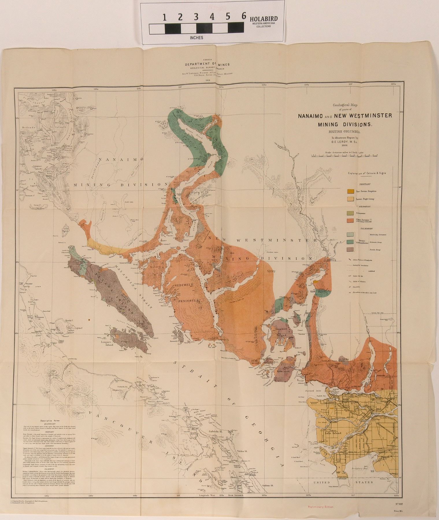 This is a map depicting the Nanaimo and Westminster Mining District of 1906, scale is 4 statute miles=1 in. completed by the Canada Dept. of Mines Geologic Survey. 28 in. X 27 in. Geologic features shown in different coloration. Condition is good.