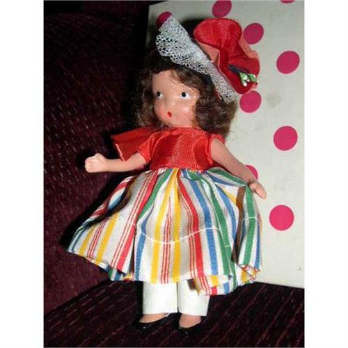 This is a frozen leg bisque doll with moveable arms. She was made by the Nancy Ann Storybook Doll Co. in the 1940's. She is all original and is nice and crispy mint. She has a bright tafetta dress and whlite cototn panties. Her white net on her black felt oval hat is crispy and her poppy is nice and red. Her dress is tied in the back with a piece of red ribbon. She has some old dried glue around her brown mohair wig. She has her white box with the red dots. The silver label says 122 which correctly identifies this doll as Alice Sweet Alice. She only has her box. She is from a smoke free environment. Buyer to pay $10 for U.S. shipping, insurance, and handling. Thanks for viewing.