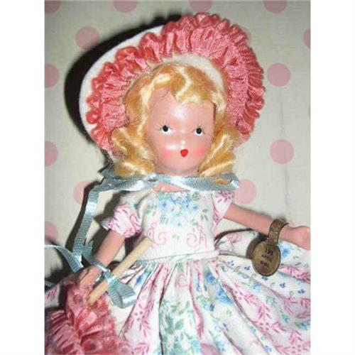 Here's a Nancy Ann Storybook Doll that is number 190 A Shower Girl for Apirl. She is all bisque with frozen legs and moveable arms. She has the blonde mohair wig. She has a white felt bonnet wiht the gathered tafetta for trim. It is tied with a blue ribbon. The dress is nice and crispy and is pinned in the back. The dress is the more unusual cotton material rather than tafetta. She has cotton material for a slip and pantaloons. She has her umbrella tie to her arm. She is from a smoke free environment. She has a white box with pink dots, labeled 190 A Shower Girl for April. She has a cardboard insert and wrist tag. One corner of the box lid is split. Buyer to pay $10 for U.S. shipping, insurance, and handling. Thanks for viewing.