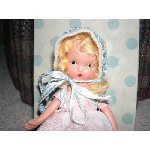 This is a 5 1/2" tall frozen leg Nancy Ann Storybook Doll called Dainty Dolly. She is in her white box with blue dots. The silver label reads Dainty Dolly pink and blue No knife can cut out love in two 130