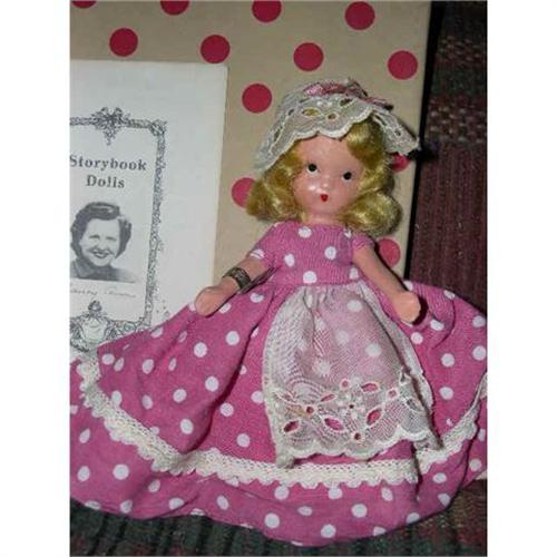 Lay a plaate and lay a cup and call the neighbors in 161. The box is white with red dots. The lid must be from a different box was it's very dingy compared to the bottom. There is a cardboard insert in the box as well as a brochure. She does have her wrist tag. She is wearing an outfit that is very colorful. It's a pink cotton dress with white dots. There is an attached white apron. Her blonde wig is great and she has an eyelet headpiece with a pink ribbon. Her dress is pinned on and she has white pantaloons. There is an attached cotton slip but it is yellowed for some reason. If you can love her, please bid She is from a smoke free environment. Buyer to pay $10 for U.S. shipping, insurance, and handling. Thanks for viewing.