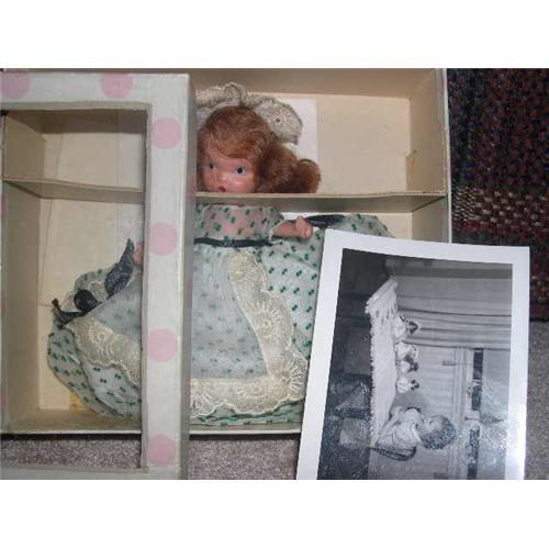 Here is a slim jointed all bisque Nancy Ann Storybook Doll. She is Jennie set the table and is in her box with her wrist tag, booklet, and cardboard insert. Someone cut the lid top and put cello in so doll could be displayed with out opening the box. The cello needs to be taped again. The box is a little grayed but doll is great. The plus is there is a picture of the original ower when she was 3 years old in 1943 and she has her Nancy Ann Storybook dolls on her table. What a treasure.