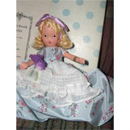 Ann Storybook Doll. She was made in the 1940's and has moveable arms. She has her white box with blue dots. It has the silver label Ring a Round a Rosy Pocket full of Posy 159 She has a blonde wig and there is a lavendar ribbon in her hair. There is some old dried glue around her face. She wears a blue tafetta floral print dress with a a white apron trimmed with a gathered row of organdy and a pocket with a purple posy. She is nice and crispy and her dress is tied in the back with a piece of ribbon. She has an attached cripsy white slip and she wears white pantaloons. Other than the glue on the side of her face, she is mint. She has her wrist tag, pamphlet and cardboard insert. What a beauty! She'll look great on your shelf. She is from a smoke free environment. Buyer to pay $10 for U.S. shipping, insurance, and handling. Thanks for viewing.