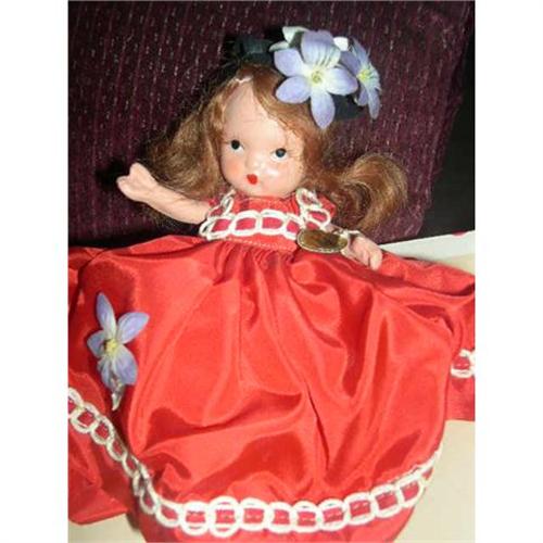 Here is Ring A Round A Rosy by the Nancy Ann Storybook Doll Co. She was made in 1941 and has the pudgy tummy and the short arms with the downward glancing face. She has the looser mohair wig and there is some old dried glue around her face. She is wearing her original outfit and has a cotton white half slip. She has the moveable arms and legs. She has her wrist tag and her box. The box has one split in the lid side and one spot where the paper is pulled up on the corner of the box bottom. The label is present and it identifies her as number 189. The box is white with red dots. She is from a smoke free environment. Buyer to pay $15 for U.S. mailing, insurance, and handling. Thanks for viewing.