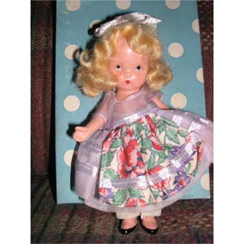 This is an all bisque Nancy Ann Storybook Doll made in 1940. She has the molded sock lines and has the pudgy tummy. She has the downward face and the short arms. She has moveable arms and legs. She comes in her blue box with white dots. The box has a little discoloration but not bad. One spot on the end and into the bottom of the box is probably a water spot. In pencil is says .75 on the bottom of the box, I'm sure that was the original price. The box has the silver label on the end that says Roses are Red Violets are Blue 113. She has her cardboard insert to hold her in place. She has a light blonde wig and a lavendar hair ribbon. The lavendar organdy dress has two rows of lavendar ribbon as trim as well as an attached floral apron with a row of lavendar ribbon. The dress has long ribbon ties which secures the dress with a box. She has white pantaloons. Her mohair wig is pulled away from the head in the back so could use a little glue. She has the storybook doll marking. She's from a smoke free environment.Buyer to pay $15 for U.S. shipping, insurance, and handing. Thanks for viewing.