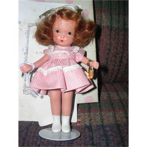 This is a jointed leg pudgy tummy bisque Nancy Ann Storybook Doll and was produced in 1941. She is 5 1/2" tall and has an auburn mohair wig with a white ribbon in her hair. Her wig is a little matted in the back. She has her wrist tag, brochure, cardboard insert and white box with pink dots. The box is a little dingy. She will display nicely on your shelf. She has a tiny check dress and white trim on the bodice and the skirt. She wears short panties and has white painted boots. She does not have the molded sock lines. She's adorable with her downward turned face. She is from a smoke free environment. Buyer to pay $10 for U.S. shipping, insurance, and handling. Thanks for viewing.