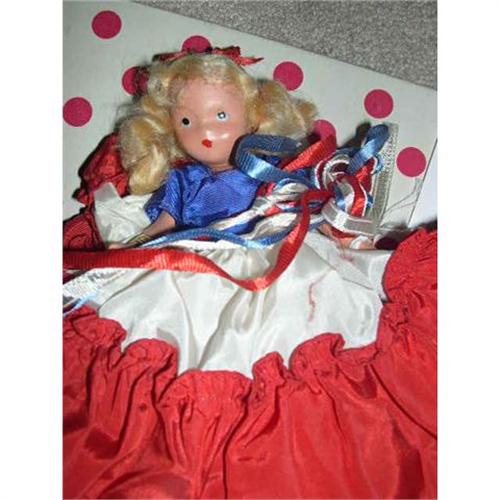 This is a jointed leg socket head bisque Nancy Ann Storybook Doll to represent July. She is all bisque and has on a great red, white, and blue tafetta dress. She has lots of red, white, and blue ribbon. She has a separate white slip and pantlaoons with lace trim. Her dress is secured with a pin. She has her blonde mohair wig which is a little fluffy! She has white box with red dots and the silver label A Very Independent Lady for July 193. She has her brochure, wrist tag, and cardboard insert to hold her in place. She is from a smoke free environment. Buyer to pay $10 for U.S. shipping, insurance and handling. Thanks for viewing.