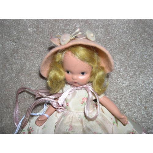 Here is a Nancy Ann Storybook Doll named Mary Had A Little Lamb. She is all bisque with moveable arms and legs. She has a blonde mohair wig, pink felt bonnet with flowers on the top and an adorable pink floral taffeta dress with a pink organdy attached apron. She has her white pantaloons. She is the slim tummy doll from 1942. She doesn't have her box or wrist tag but will look nice on your shelf. She is from a smoke free environment. Buyer to pay $10 for U.S. shipping, insurance, and handling. Thanks for viewing.