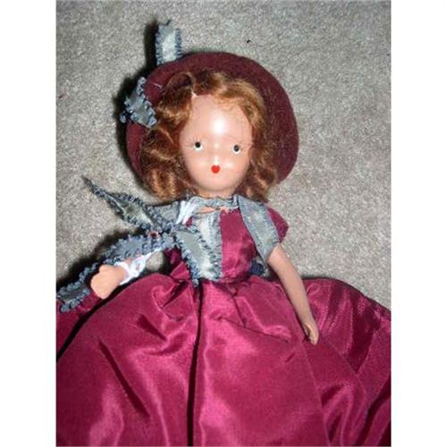 Here is a bisque Nancy Ann Storybook October Doll that was made in the 1940's. She has the frozen bisque legs and the moveable arms. She is in her all original outfit. She has a burgandy taffeta dress with an attached slip. She wears pantaloons and her felt bonnet has the same trim and tie material as the trim on the bodice of the dress. The dress is secured in the back with a piece of blue ribbon. The doll has an auburn mohair wig and painted features. She has painted black slippers. Buyer to pay $10 for U.S. shipping, insurance, and handling. If you can love her, please bid. Thanks for viewing.