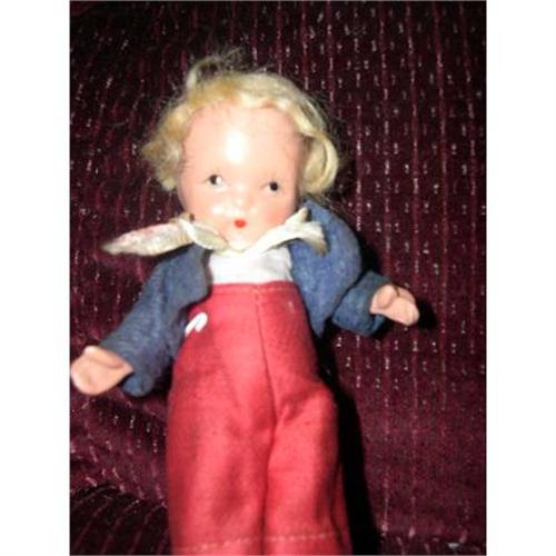 This is a bisque Nancy Ann Storybook representing A Dillar A Dollar a Ten O'Clock Scholar. He is a jointed leg bisque dolls. His arms and legs all move. He has a thin light blonde mohair wig and it's flyaway as most of the boy wigs were. The short mohair and the curls was just almost unmanageable. He has the molded socks and the black painted shoes. He has the very light blue eyes. He has nice cheek coloring. His clothes are all original. On the back of his pants there is an area where there is some black rub to it. He is from a smoke free environment. If you can love him, please bid. Buyer to pay $15 for U.S. shipping, insurance, and handling. Thanks for viewing.