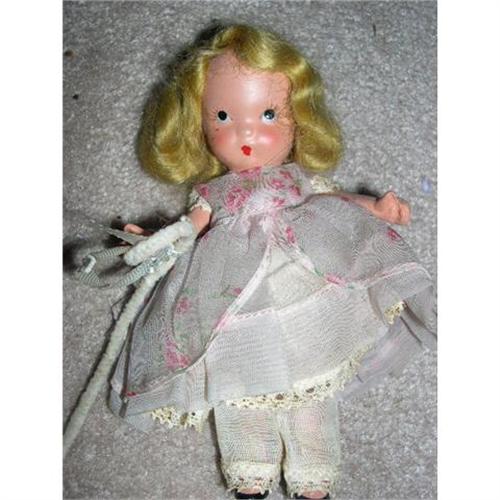 Here is a 5 1/2" tall Nancy Ann Storybook doll with the moveable legs and arms.The earlier jointed legs dolls were only made until 1942. She is a pudgy tummy doll from 1941. She has the downward turned head. Her facial coloring is great. She wears her original outfit but is missing her hat. You could wash the organdy dress to brighten it up. Organdy washing fine. It's a little grayed. She has her short half slip with lace and her lace trimmed pantaloons. She has the short arms and has her pipe cleaner staff still tied to her arm with a piece of blue Nancy Ann ribbon. With a little TLC, she will look great on your shelf. There are no chips or damage to the bisque. Buyer to pay $10 for U.S. shipping, insurance, and handling. Thanks for viewing.