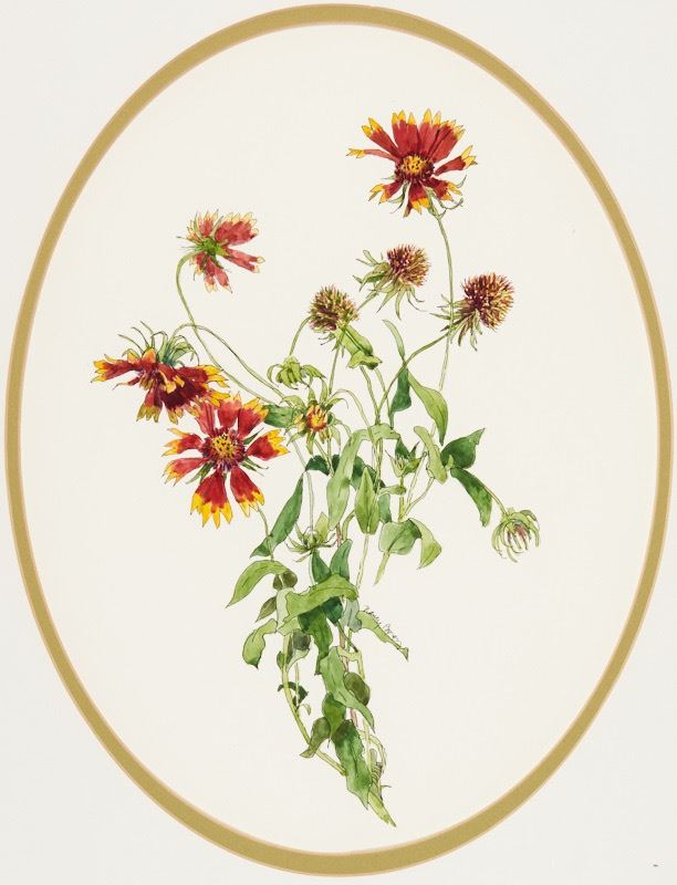 To the unaided eye, this piece appears to be in very good condition. Inspection under ultraviolet light reveals a normal fluorescence of the artist's pigments. There are no signs of damage or restoration. The piece is mounted under glass with a white and green double mat that has an ovular window. The frame is a simple dark antiqued gold molding and is in good condition, showing normal signs of wear. The piece has not been inspected outside of the frame. Verso: [handwritten on backing] #117 "Firewheels"