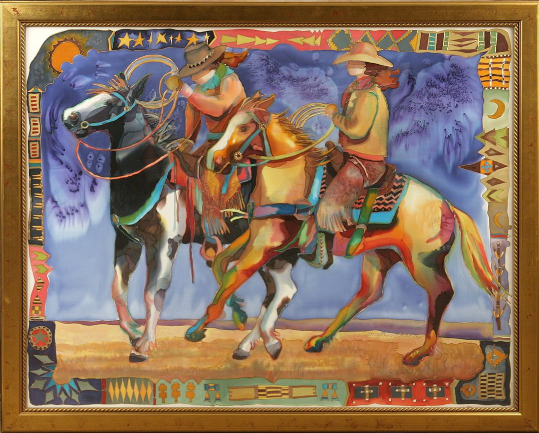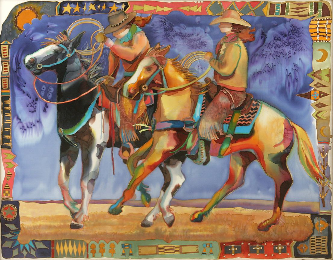 Nancy Cawdrey (b. 1948). Ropin' Sisters. 44" x 56" mixed media on silk. Signed in image: Nancy Dunlop Cawdrey 2007. (est. $5,000-7,000). Lot includes a copy of the collector's limited edition book Sky's The Limit, #68/300. Signed by Nancy Cawdrey.. CONDITION REPORTS: www.auctioninsantafe.com/docs/cr2012.pdf