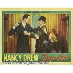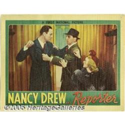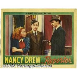 <B>Nancy Drew...Reporter (First National, 1939)</B></I> Lobby Cards (2) (11" X 14"). In this second film in the series from the Warner Brothers B-Unit, Bonita Granville reprises her role as the spunky teen detective Nancy Drew. While trying to win a contest for junior reporters, Nancy starts investigating the murder of a local socialite. She becomes convinced that the accused ward of the murder victim is not the true killer. With the help of her friend Ted Nickerson, she hunts down the clues and unveils the truth. Co-starring John Litel and Frankie Thomas. Pinholes, slight edge wear, a few small stains and the light toning that is to be expected from Warner Brothers linen stock. One of the cards has a pinhole and scratch in the image area. Fine. 2 items