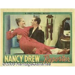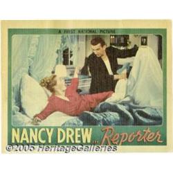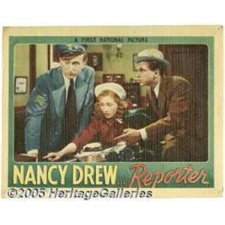 <B>Nancy Drew...Reporter (First National, 1939)</B></I> Lobby Cards (3) (11" X 14"). Nancy Drew (Bonita Granville) is on the prowl in the case of a poisoned woman. Nancy is convinced that the young girl accused of the crime is innocent. Her friend Ted Nickerson (Frankie Thomas) helps her sift through the clues while on the trail of the real killer, and she gets support from her father (John Litel). Bonita Granville is featured on all three of these scene cards. Pinholes (including some in the image area), small scuffs, edge wear, a few tears and the toning that is usual with Warner Brothers linen stock. Materials from the Nancy Drew series are rarely offered at auction. Here's your chance now. Fine. 3 items