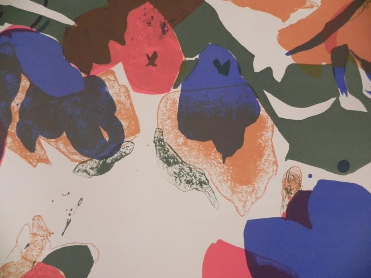 This playful abstract piece is a collage of coloful abstract forms. Artist: Nancy Genn Signature: "Nancy Genn" in pencil, lower right Medium: Lithograph on rag paper, with deckled edges top and bottom Edition: Unnumbered, dedicated artist proof, marked in pencil, lower left: "With my regards for Michel, Spring '69" Year: 1969 Sheet size: 34 1/2 x 24 inches Condition: Excellent Biography:Nancy Genn is from California, and studied at the California School of Fine Arts (now known as The San Francisco Art Institute) and the University of California, Berkeley. Her early career was influenced greatly by her travels throughout Asia, and Europe. Her first worldwide recognition came in the 1970's during her experiments with hand made paper. Her three-dimensional abstract paper technique became known as the "Genn method", and she helped revitalize an interest in paper itself as part of the art form. She continued to work in abstract, gaining positive reception, and winning awards. She has participated in numerous solo and group exhibits spanning five decades. Her work today can be found at many prestigous museums, including the Museum of Modern Art, New York, Los Angles County Museum, and the Auckland Museum, New Zealand. Her art is also in the collections of many respected corporations, including AT & T, Hewlett Packard, Nordstroms, and Lehman Bros. We are pleased to present from an estate a group of dedicated artist proofs.