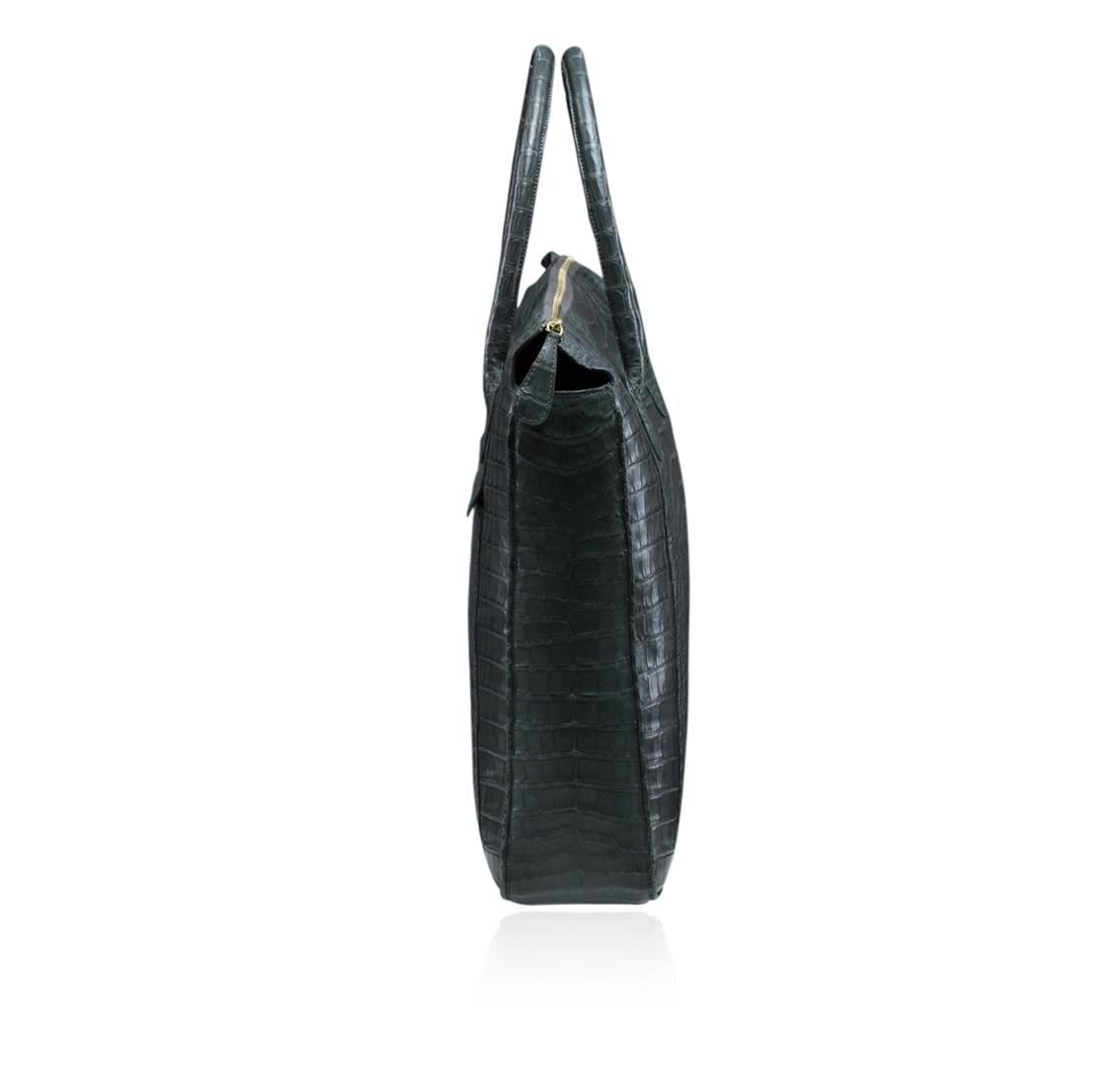 One authentic Nancy Gonzales Large Grey Crocodile Tote. This roomy tote epitomizes everyday sophistication and makes a perfect everyday bag, large enough to hold all your essentials in style. The classic tote style features a zip closure and double top handles. The flexible sides allow for easy expansion. Made from the highest quality crocodile skin. Estimated retail value $3,560.00.