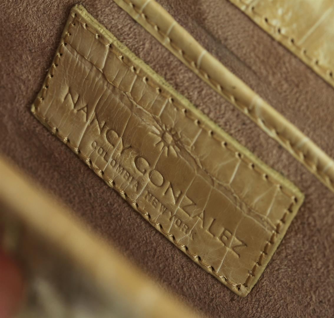 One Nancy Gonzalez Crocodile Clutch Bag. Nancy Gonzalez is considered by many as one of the premier handbag designers in the world. The item is in good condition with light signs of wear. Features: Flap top magnetic closure; suede lining and one interior pocket; highest quality crocodile skin. Measures 9.75"W x 4.75"H. Comes with dust bag.
