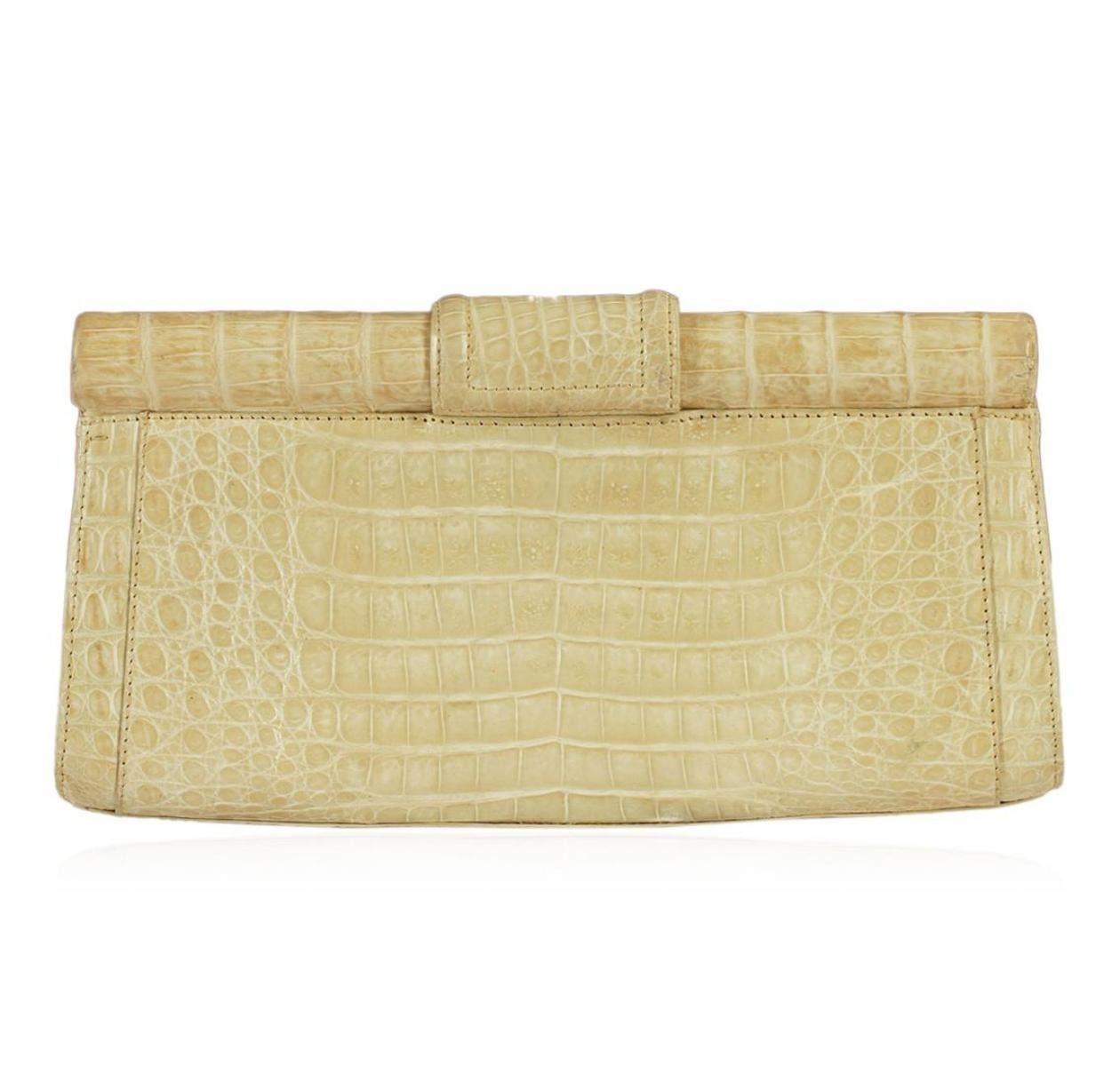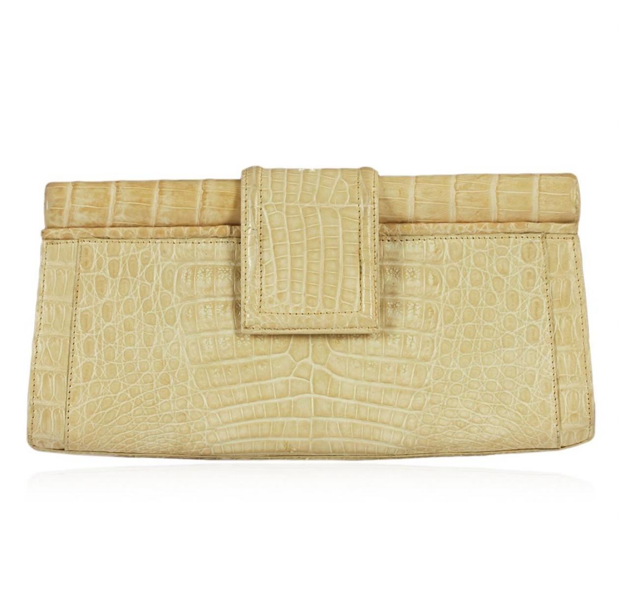 One Nancy Gonzalez Crocodile Clutch Bag. Nancy Gonzalez is considered by many as one of the premier handbag designers in the world. The item is in good condition with light signs of wear. Features: Flap top magnetic closure; suede lining and one interior pocket; highest quality crocodile skin. Measures 9.75"W x 4.75"H. Comes with dust bag.